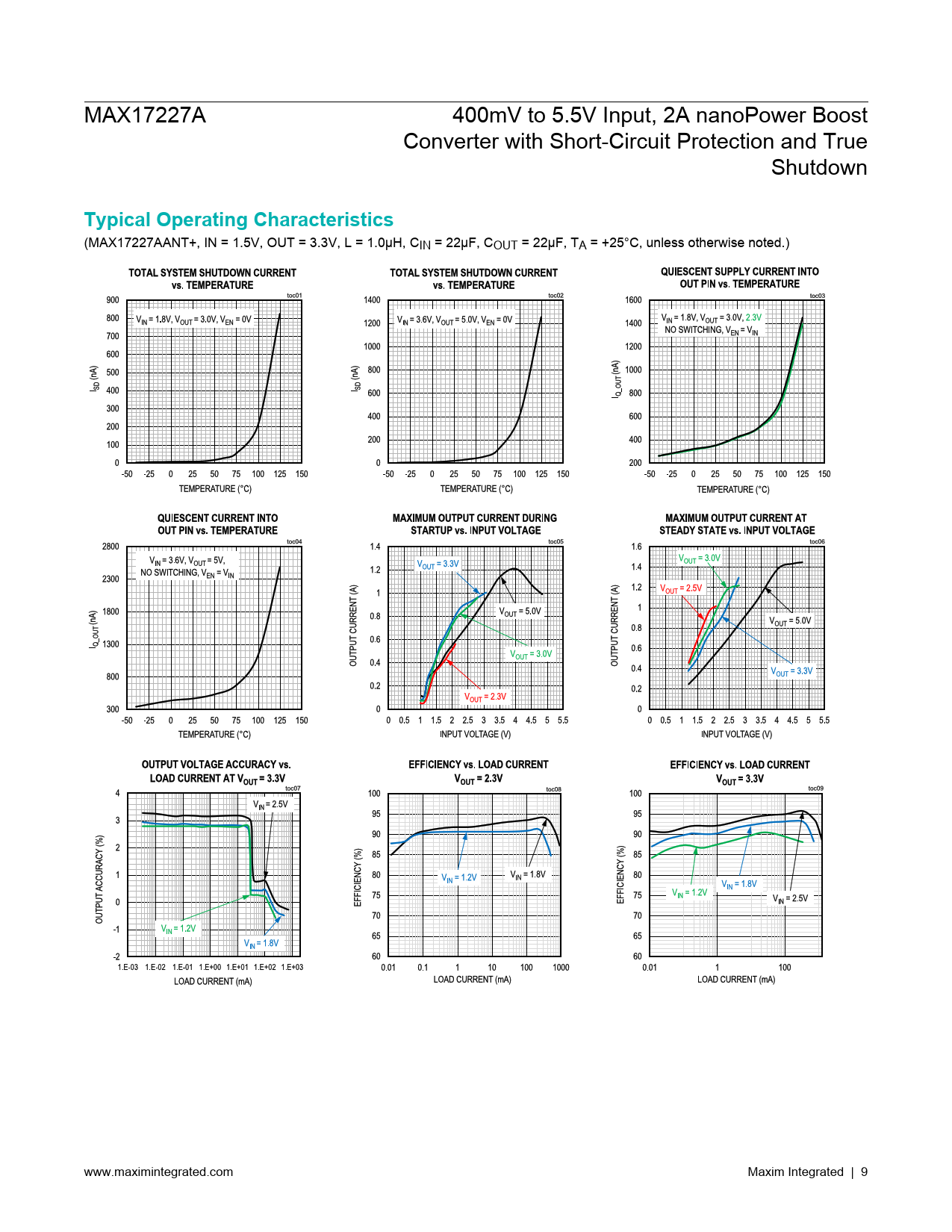 (MAX17227AANT+, IN = 1.5V, OUT = 3.3V, L = 1.0μH, CIN = 22μF, COUT = 22μF, TA = +25°C, unless otherwise noted.) www.maximintegrated.com Maxim Integrated | 9 Document Outline General Description Applications Benefits and Features Typical Operating Circuit Absolute Maximum Ratings Package Information TDFN WLP Electrical Characteristics Electrical Characteristics (continued) Typical Operating Characteristics Typical Operating Characteristics (continued) Pin Configurations WLP TDFN Pin Description Functional Diagrams Detailed Description Control Scheme Output Voltage Selection Fixed-Output Voltage Version Features Enable Soft-Start Control Short-Circuit Protection Thermal Shutdown Design Procedure Inductor Selection Input Capacitor Output Capacitor PCB Layout Guidelines Thermal Considerations Ordering Information Revision History