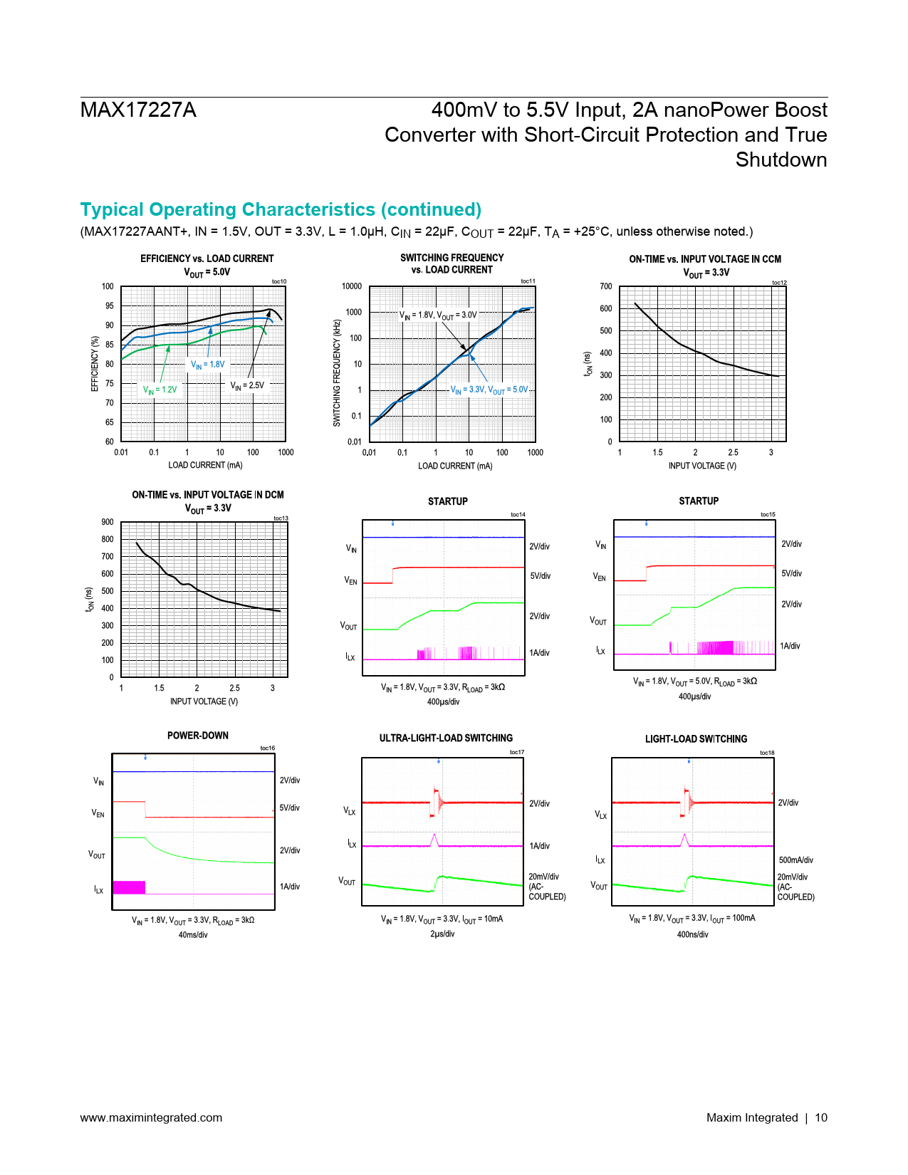 (MAX17227AANT+, IN = 1.5V, OUT = 3.3V, L = 1.0μH, CIN = 22μF, COUT = 22μF, TA = +25°C, unless otherwise noted.) www.maximintegrated.com Maxim Integrated | 10 Document Outline General Description Applications Benefits and Features Typical Operating Circuit Absolute Maximum Ratings Package Information TDFN WLP Electrical Characteristics Electrical Characteristics (continued) Typical Operating Characteristics Typical Operating Characteristics (continued) Pin Configurations WLP TDFN Pin Description Functional Diagrams Detailed Description Control Scheme Output Voltage Selection Fixed-Output Voltage Version Features Enable Soft-Start Control Short-Circuit Protection Thermal Shutdown Design Procedure Inductor Selection Input Capacitor Output Capacitor PCB Layout Guidelines Thermal Considerations Ordering Information Revision History