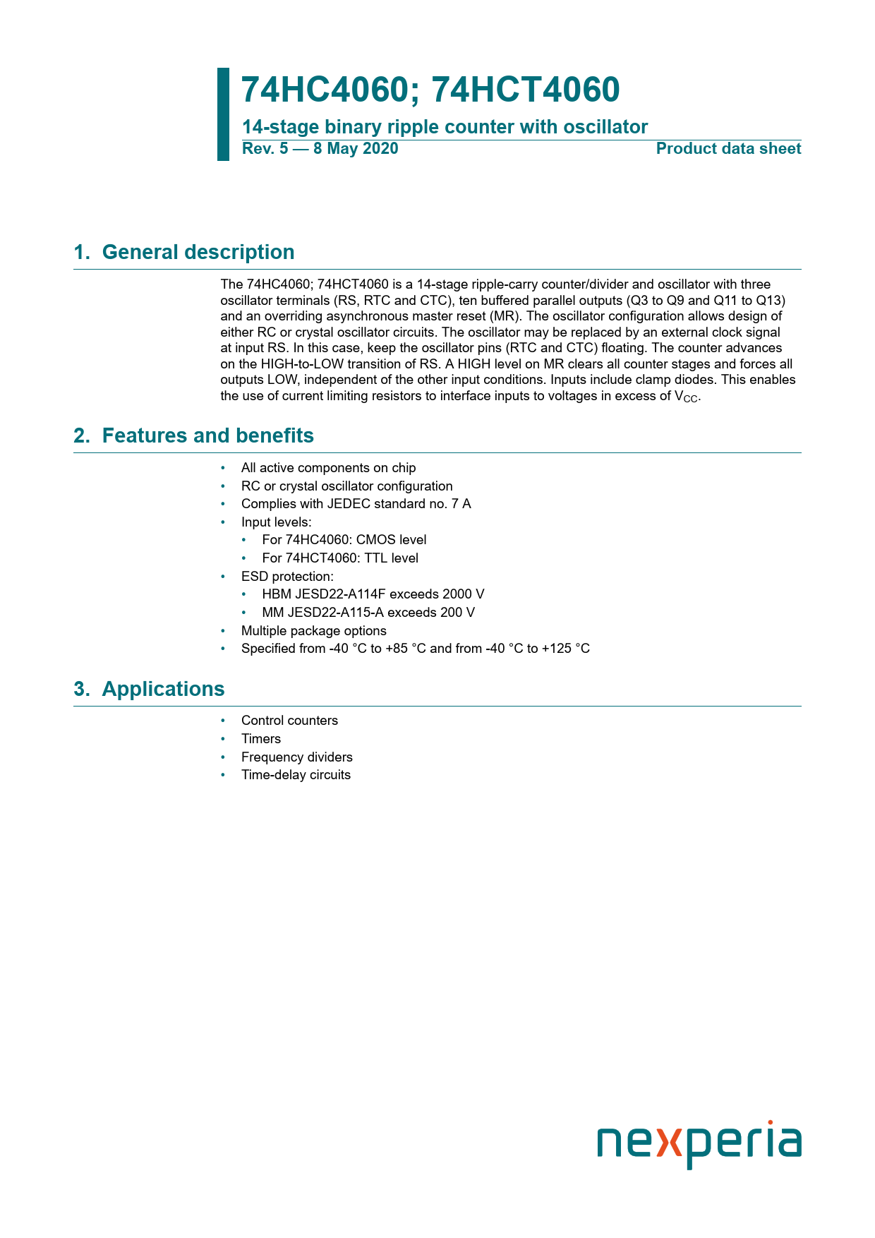 74HC4060; 74HCT406014-stage binary ripple counter with oscillatorRev. 5 — 8 May 2020Product data sheet1. General description The 74HC4060; 74HCT4060 is a 14-stage ripple-carry counter/divider and oscillator with three oscil ator terminals (RS, RTC and CTC), ten buf ered paral el outputs (Q3 to Q9 and Q11 to Q13) and an overriding asynchronous master reset (MR). The oscillator configuration allows design of either RC or crystal oscillator circuits. The oscillator may be replaced by an external clock signal at input RS. In this case, keep the oscil ator pins (RTC and CTC) floating. The counter advances on the HIGH-to-LOW transition of RS. A HIGH level on MR clears all counter stages and forces all outputs LOW, independent of the other input conditions. Inputs include clamp diodes. This enables the use of current limiting resistors to interface inputs to voltages in excess of VCC. 2. Features and benefits • All active components on chip • RC or crystal oscillator configuration • Complies with JEDEC standard no. 7 A • Input levels: • For 74HC4060: CMOS level • For 74HCT4060: TTL level • ESD protection: • HBM JESD22-A114F exceeds 2000 V • MM JESD22-A115-A exceeds 200 V • Multiple package options • Specified from -40 °C to +85 °C and from -40 °C to +125 °C 3. Applications • Control counters • Timers • Frequency dividers • Time-delay circuits Document Outline 1. General description 2. Features and benefits 3. Applications 4. Ordering information 5. Functional diagram 6. Pinning information 6.1. Pinning 6.2. Pin description 7. Functional description 8. Limiting values 9. Recommended operating conditions 10. Static characteristics 11. Dynamic characteristics 11.1. Waveforms and test circuit 12. RC oscillator 12.1. Timing component limitations 12.2. Typical crystal oscillator circuit 13. Package outline 14. Abbreviations 15. Revision history 16. Legal information Contents