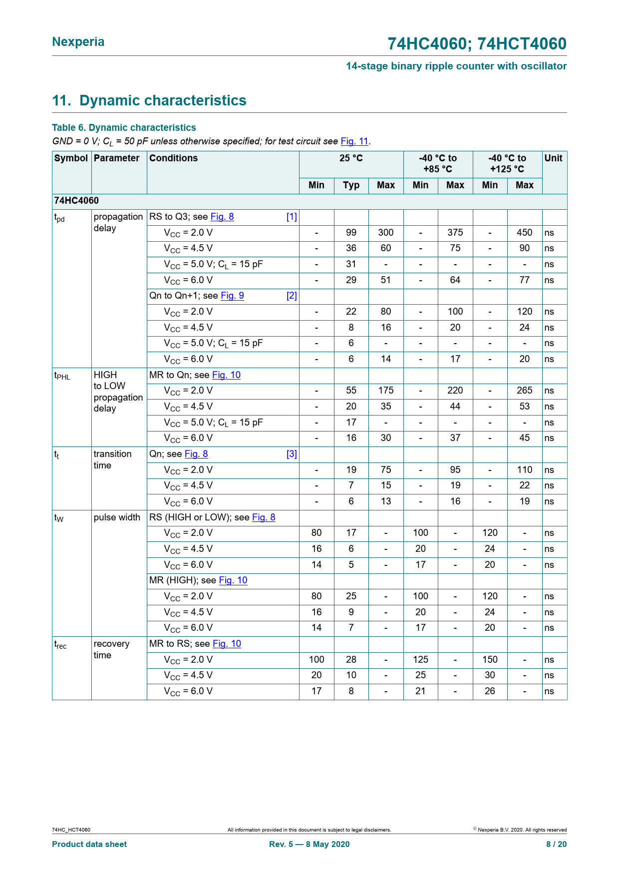 Nexperia 74HC4060; 74HCT4060 14-stage binary ripple counter with oscillator 11. Dynamic characteristics Table 6. Dynamic characteristics