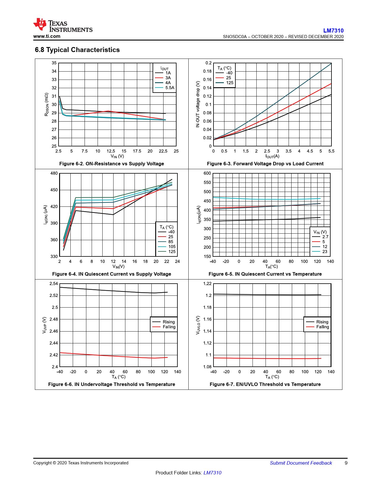 6.8 Typical Characteristics Figure 6-2. ON-Resistance vs Supply Voltage Figure 6-3. Forward Voltage Drop vs Load Current Figure 6-4. IN Quiescent Current vs Supply Voltage Figure 6-5. IN Quiescent Current vs Temperature Figure 6-6. IN Undervoltage Threshold vs Temperature Figure 6-7. EN/UVLO Threshold vs Temperature