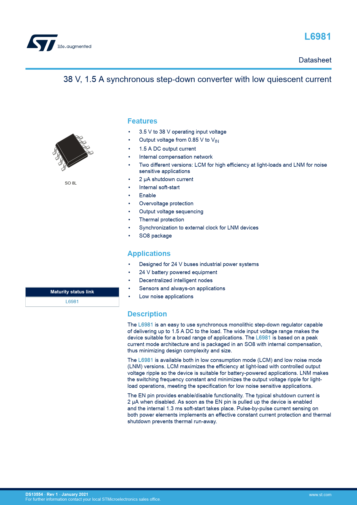 Páginas / Página49 / 1 — L6981. Features. Applications. Maturity status link. Description. …