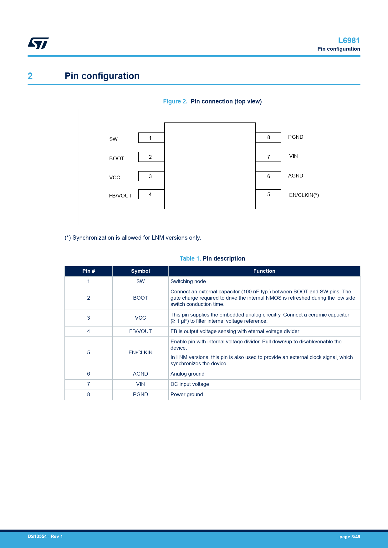 1 8 SW PGND 2 7 BOOT VIN 3 6 VCC AGND 4 5 FB/VOUT EN/CLKIN(*) (*) Synchronization is allowed for LNM versions only.