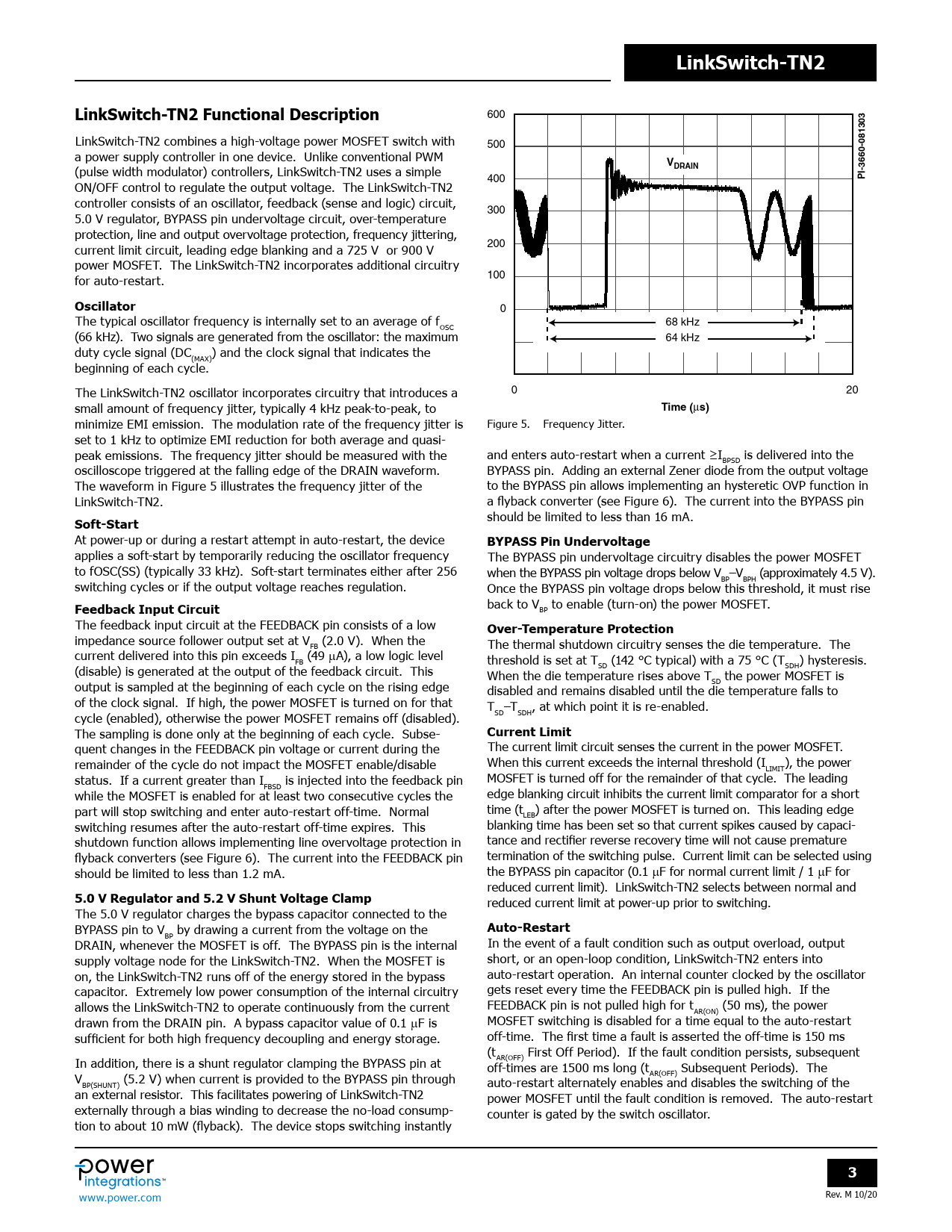 LinkSwitch-TN2LinkSwitch-TN2 Functional Description 600 LinkSwitch-TN2 combines a high-voltage power MOSFET switch with 500 a power supply control er in one device. Unlike conventional PWM V (pulse width modulator) control ers, LinkSwitch-TN2 uses a simple DRAINPI-3660-081303 400 ON/OFF control to regulate the output voltage. The LinkSwitch-TN2 control er consists of an oscillator, feedback (sense and logic) circuit, 300 5.0 V regulator, BYPASS pin undervoltage circuit, over-temperature protection, line and output overvoltage protection, frequency jittering, current limit circuit, leading edge blanking and a 725 V or 900 V 200 power MOSFET. The LinkSwitch-TN2 incorporates additional circuitry for auto-restart. 100 Oscillator 0 The typical oscillator frequency is internal y set to an average of f 68 kHz OSC (66 kHz). Two signals are generated from the oscillator: the maximum 64 kHz duty cycle signal (DC ) and the clock signal that indicates the (MAX) beginning of each cycle. The LinkSwitch-TN2 oscillator incorporates circuitry that introduces a 0 20 small amount of frequency jitter, typical y 4 kHz peak-to-peak, to Time ( µ s) minimize EMI emission. The modulation rate of the frequency jitter is Figure 5. Frequency Jitter. set to 1 kHz to optimize EMI reduction for both average and quasi- peak emissions. The frequency jitter should be measured with the and enters auto-restart when a current ≥I is delivered into the BPSD oscilloscope triggered at the falling edge of the DRAIN waveform. BYPASS pin. Adding an external Zener diode from the output voltage The waveform in Figure 5 il ustrates the frequency jitter of the to the BYPASS pin al ows implementing an hysteretic OVP function in LinkSwitch-TN2. a flyback converter (see Figure 6). The current into the BYPASS pin Soft-Start should be limited to less than 16 mA. At power-up or during a restart attempt in auto-restart, the device BYPASS Pin Undervoltage applies a soft-start by temporarily reducing the oscillator frequency The BYPASS pin undervoltage circuitry disables the power MOSFET to fOSC(SS) (typical y 33 kHz). Soft-start terminates either after 256 when the BYPASS pin voltage drops below V –V (approximately 4.5 V). switching cycles or if the output voltage reaches regulation. BP BPH Once the BYPASS pin voltage drops below this threshold, it must rise Feedback Input Circuit back to V to enable (turn-on) the power MOSFET. BP The feedback input circuit at the FEEDBACK pin consists of a low Over-Temperature Protection impedance source fol ower output set at V (2.0 V). When the FB The thermal shutdown circuitry senses the die temperature. The current delivered into this pin exceeds I (49 μA), a low logic level FB threshold is set at T (142 °C typical) with a 75 °C (T ) hysteresis. (disable) is generated at the output of the feedback circuit. This SD SDH When the die temperature rises above T the power MOSFET is output is sampled at the beginning of each cycle on the rising edge SD disabled and remains disabled until the die temperature fal s to of the clock signal. If high, the power MOSFET is turned on for that T –T , at which point it is re-enabled. cycle (enabled), otherwise the power MOSFET remains off (disabled). SD SDH The sampling is done only at the beginning of each cycle. Subse- Current Limit quent changes in the FEEDBACK pin voltage or current during the The current limit circuit senses the current in the power MOSFET. remainder of the cycle do not impact the MOSFET enable/disable When this current exceeds the internal threshold (I ), the power LIMIT status. If a current greater than I is injected into the feedback pin MOSFET is turned off for the remainder of that cycle. The leading FBSD while the MOSFET is enabled for at least two consecutive cycles the edge blanking circuit inhibits the current limit comparator for a short part will stop switching and enter auto-restart off-time. Normal time (t ) after the power MOSFET is turned on. This leading edge LEB switching resumes after the auto-restart off-time expires. This blanking time has been set so that current spikes caused by capaci- shutdown function al ows implementing line overvoltage protection in tance and rectifier reverse recovery time will not cause premature flyback converters (see Figure 6). The current into the FEEDBACK pin termination of the switching pulse. Current limit can be selected using should be limited to less than 1.2 mA. the BYPASS pin capacitor (0.1 μF for normal current limit / 1 μF for reduced current limit). LinkSwitch-TN2 selects between normal and 5.0 V Regulator and 5.2 V Shunt Voltage Clamp reduced current limit at power-up prior to switching. The 5.0 V regulator charges the bypass capacitor connected to the BYPASS pin to V by drawing a current from the voltage on the Auto-Restart BP DRAIN, whenever the MOSFET is off. The BYPASS pin is the internal In the event of a fault condition such as output overload, output supply voltage node for the LinkSwitch-TN2. When the MOSFET is short, or an open-loop condition, LinkSwitch-TN2 enters into on, the LinkSwitch-TN2 runs off of the energy stored in the bypass auto-restart operation. An internal counter clocked by the oscillator capacitor. Extremely low power consumption of the internal circuitry gets reset every time the FEEDBACK pin is pulled high. If the al ows the LinkSwitch-TN2 to operate continuously from the current FEEDBACK pin is not pulled high for t (50 ms), the power AR(ON) drawn from the DRAIN pin. A bypass capacitor value of 0.1 μF is MOSFET switching is disabled for a time equal to the auto-restart sufficient for both high frequency decoupling and energy storage. off-time. The first time a fault is asserted the off-time is 150 ms (t First Off Period). If the fault condition persists, subsequent In addition, there is a shunt regulator clamping the BYPASS pin at AR(OFF) off-times are 1500 ms long (t Subsequent Periods). The V (5.2 V) when current is provided to the BYPASS pin thr