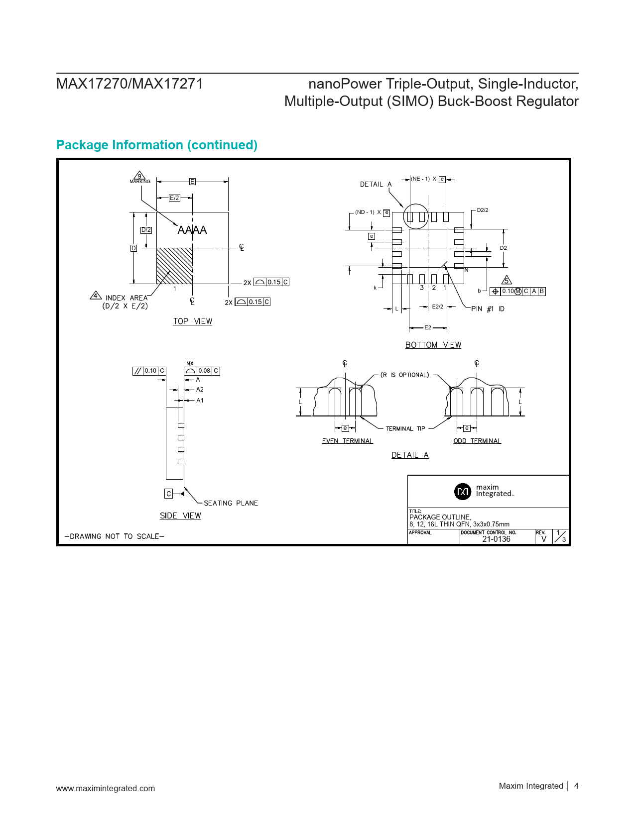 MARKING E (NE - 1) X e E/2 (ND - 1) X e D2/2 D/2 AAAA e D L C D2 k b 0.10 M C A B L C E2/2 L E2 L C CL 0.10 C 0.08 C A A2 A1 L L e e maxim integratedTM PACKAGE OUTLINE, 8, 12, 16L THIN QFN, 3x3x0.75mm 1 21-0136 V 3 www.maximintegrated.com Maxim Integrated │ 4