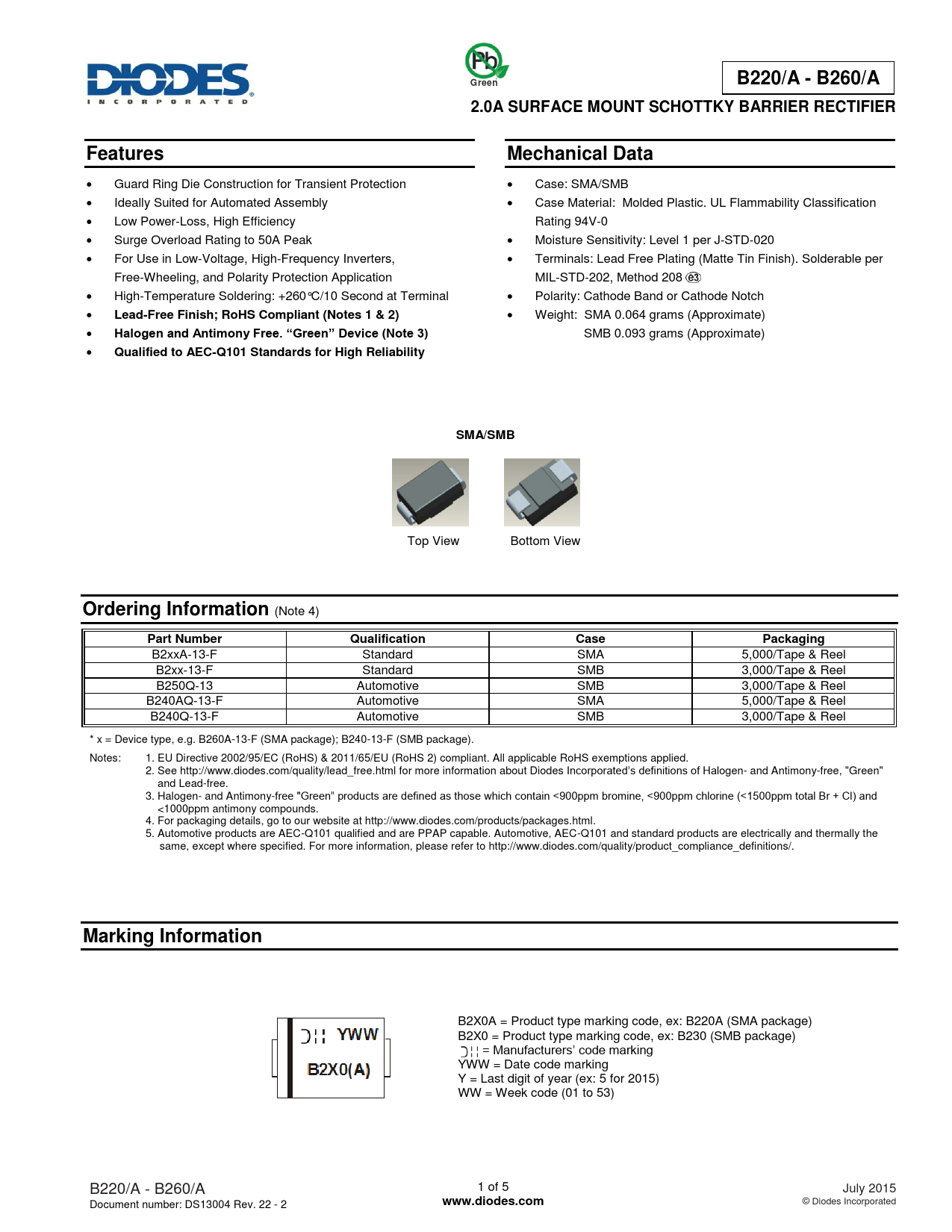 B2X0A = Product type marking code, ex: B220A (SMA package) B2X0 = Product type marking code, ex: B230 (SMB package) = Manufacturers’ code marking YWW = Date code marking Y = Last digit of year (ex: 5 for 2015) WW = Week code (01 to 53) B220/A - B260/A 1 of 5 July 2015 Document number: DS13004 Rev. 22 - 2