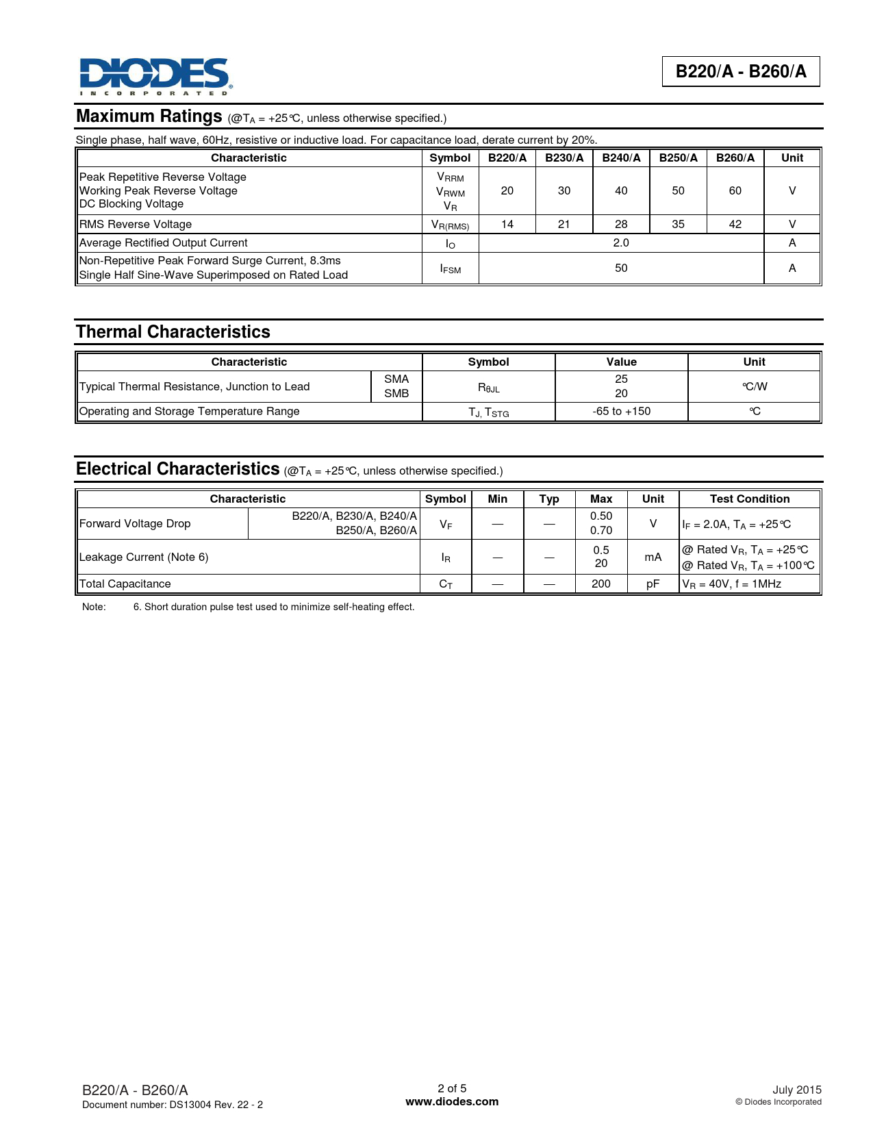B220/A - B260/A. Maximum Ratings. Characteristic. Symbol. B220/A. B230/A. B240/A. B250/A. B260/A. Unit. Thermal Characteristics. Value
