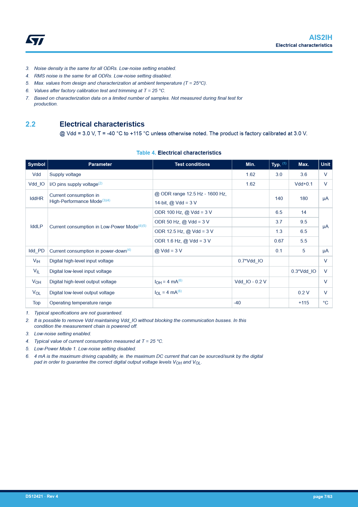 Páginas / Página63 / 7 — AIS2IH. Electrical characteristics. 2.2. Table 4. Electrical …