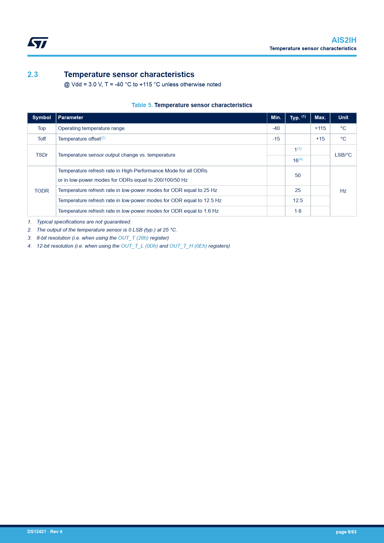 AIS2IH. Temperature sensor characteristics. 2.3. Table 5. Temperature sensor characteristics. Symbol. Parameter. Min. Typ. (1). Max. Unit