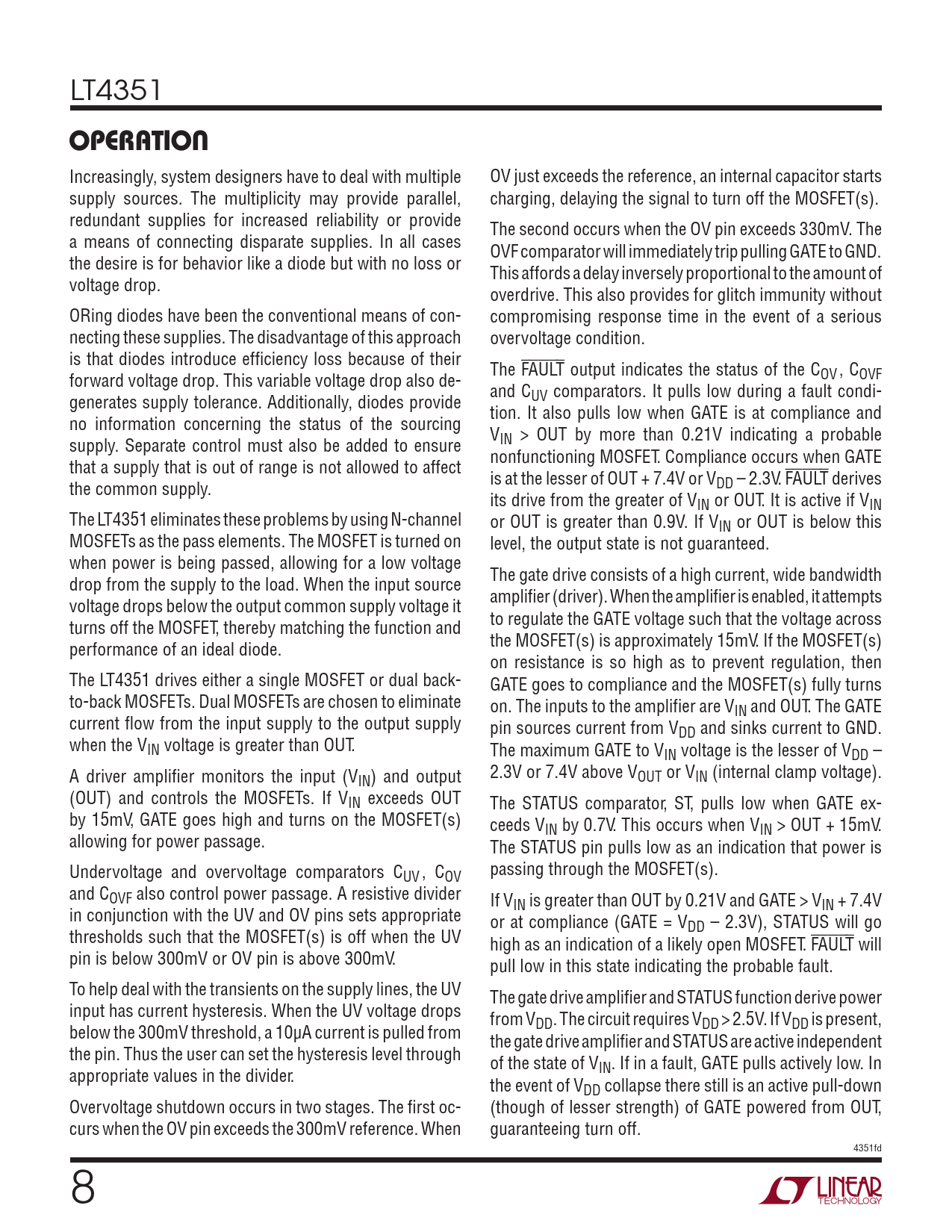 LT4351 OPERATION Increasingly, system designers have to deal with multiple OV just exceeds the reference, an internal capacitor starts supply sources. The multiplicity may provide parallel, charging, delaying the signal to turn off the MOSFET(s). redundant supplies for increased reliability or provide The second occurs when the OV pin exceeds 330mV. The a means of connecting disparate supplies. In all cases OVF comparator wil immediately trip pul ing GATE to GND. the desire is for behavior like a diode but with no loss or This affords a delay inversely proportional to the amount of voltage drop. overdrive. This also provides for glitch immunity without ORing diodes have been the conventional means of con- compromising response time in the event of a serious necting these supplies. The disadvantage of this approach overvoltage condition. is that diodes introduce efficiency loss because of their forward voltage drop. This variable voltage drop also de- The FAULT output indicates the status of the COV, COVF generates supply tolerance. Additionally, diodes provide and CUV comparators. It pulls low during a fault condi- no information concerning the status of the sourcing tion. It also pulls low when GATE is at compliance and supply. Separate control must also be added to ensure VIN > OUT by more than 0.21V indicating a probable that a supply that is out of range is not allowed to affect nonfunctioning MOSFET. Compliance occurs when GATE the common supply. is at the lesser of OUT + 7.4V or VDD – 2.3V. FAULT derives its drive from the greater of VIN or OUT. It is active if VIN The LT4351 eliminates these problems by using N-channel or OUT is greater than 0.9V. If VIN or OUT is below this MOSFETs as the pass elements. The MOSFET is turned on level, the output state is not guaranteed. when power is being passed, allowing for a low voltage drop from the supply to the load. When the input source The gate drive consists of a high current, wide bandwidth voltage drops below the output common supply voltage it amplifier (driver). When the amplifier is enabled, it attempts turns off the MOSFET, thereby matching the function and to regulate the GATE voltage such that the voltage across performance of an ideal diode. the MOSFET(s) is approximately 15mV. If the MOSFET(s) on resistance is so high as to prevent regulation, then The LT4351 drives either a single MOSFET or dual back- GATE goes to compliance and the MOSFET(s) fully turns to-back MOSFETs. Dual MOSFETs are chosen to eliminate on. The inputs to the amplifier are VIN and OUT. The GATE current flow from the input supply to the output supply pin sources current from VDD and sinks current to GND. when the VIN voltage is greater than OUT. The maximum GATE to VIN voltage is the lesser of VDD – A driver amplifier monitors the input (VIN) and output 2.3V or 7.4V above VOUT or VIN (internal clamp voltage). (OUT) and controls the MOSFETs. If VIN exceeds OUT The STATUS comparator, ST, pulls low when GATE ex- by 15mV, GATE goes high and turns on the MOSFET(s) ceeds V allowing for power passage. IN by 0.7V. This occurs when VIN > OUT + 15mV. The STATUS pin pulls low as an indication that power is Undervoltage and overvoltage comparators CUV, COV passing through the MOSFET(s). and COVF also control power passage. A resistive divider If V in conjunction with the UV and OV pins sets appropriate IN is greater than OUT by 0.21V and GATE > VIN + 7.4V or at compliance (GATE = V thresholds such that the MOSFET(s) is off when the UV DD – 2.3V), STATUS will go high as an indication of a likely open MOSFET. FAULT will pin is below 300mV or OV pin is above 300mV. pull low in this state indicating the probable fault. To help deal with the transients on the supply lines, the UV The gate drive amplifier and STATUS function derive power input has current hysteresis. When the UV voltage drops from V below the 300mV threshold, a 10µA current is pulled from DD. The circuit requires VDD > 2.5V. If VDD is present, the gate drive amplifier and STATUS are active independent the pin. Thus the user can set the hysteresis level through of the state of V appropriate values in the divider. IN. If in a fault, GATE pulls actively low. In the event of VDD collapse there still is an active pull-down Overvoltage shutdown occurs in two stages. The first oc- (though of lesser strength) of GATE powered from OUT, curs when the OV pin exceeds the 300mV reference. When guaranteeing turn off. 4351fd 8 Document Outline Features Applications Description Typical Application Absolute Maximum Ratings Pin Configuration Order Information Electrical Characteristics Typical Performance Characteristics Pin Functions Block Diagram Operation Applications Information Package Description Revision History Typical Application Related Parts