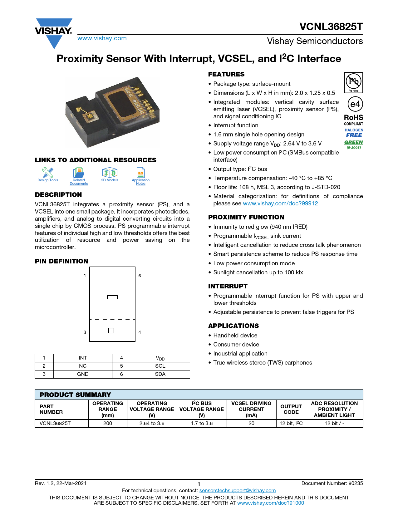 VCNL36825T. Proximity Sensor With Interrupt, VCSEL, and I2C Interface. FEATURES. LINKS TO ADDITIONAL RESOURCES. D 3. 3 D