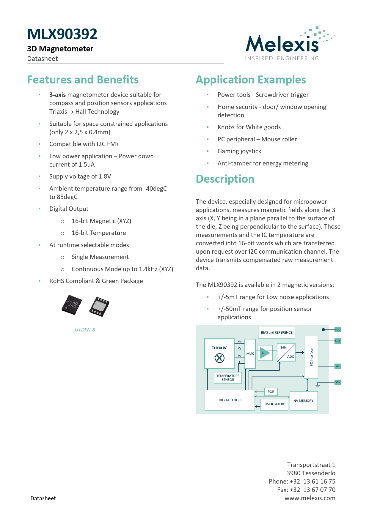 MLX903923D Magnetometer Datasheet Features and BenefitsApplication Examples ▪ 3-axis magnetometer device suitable for ▪ Power tools - Screwdriver trigger compass and position sensors applications ▪ Home security - door/ window opening Triaxis Hall Technology detection ▪ Suitable for space constrained applications ▪ Knobs for White goods (only 2 x 2,5 x 0.4mm) ▪ PC peripheral – Mouse roller ▪ Compatible with I2C FM+ ▪ Gaming joystick ▪ Low power application – Power down current of 1.5uA ▪ Anti-tamper for energy metering ▪ Supply voltage of 1.8V Description ▪ Ambient temperature range from -40degC to 85degC The device, especially designed for micropower ▪ Digital Output applications, measures magnetic fields along the 3 o 16-bit Magnetic (XYZ) axis (X, Y being in a plane parallel to the surface of the die, Z being perpendicular to the surface). Those o 16-bit Temperature measurements and the IC temperature are ▪ At runtime selectable modes converted into 16-bit words which are transferred upon request over I2C communication channel. The o Single Measurement device transmits compensated raw measurement o Continuous Mode up to 1.4kHz (XYZ) data. ▪ RoHS Compliant & Green Package The MLX90392 is available in 2 magnetic versions: ▪ +/-5mT range for Low noise applications ▪ +/-50mT range for position sensor applications UTDFN-8 Transportstraat 1 3980 Tessenderlo Phone: +32 13 61 16 75 Fax: +32 13 67 07 70 Datasheet www.melexis.com