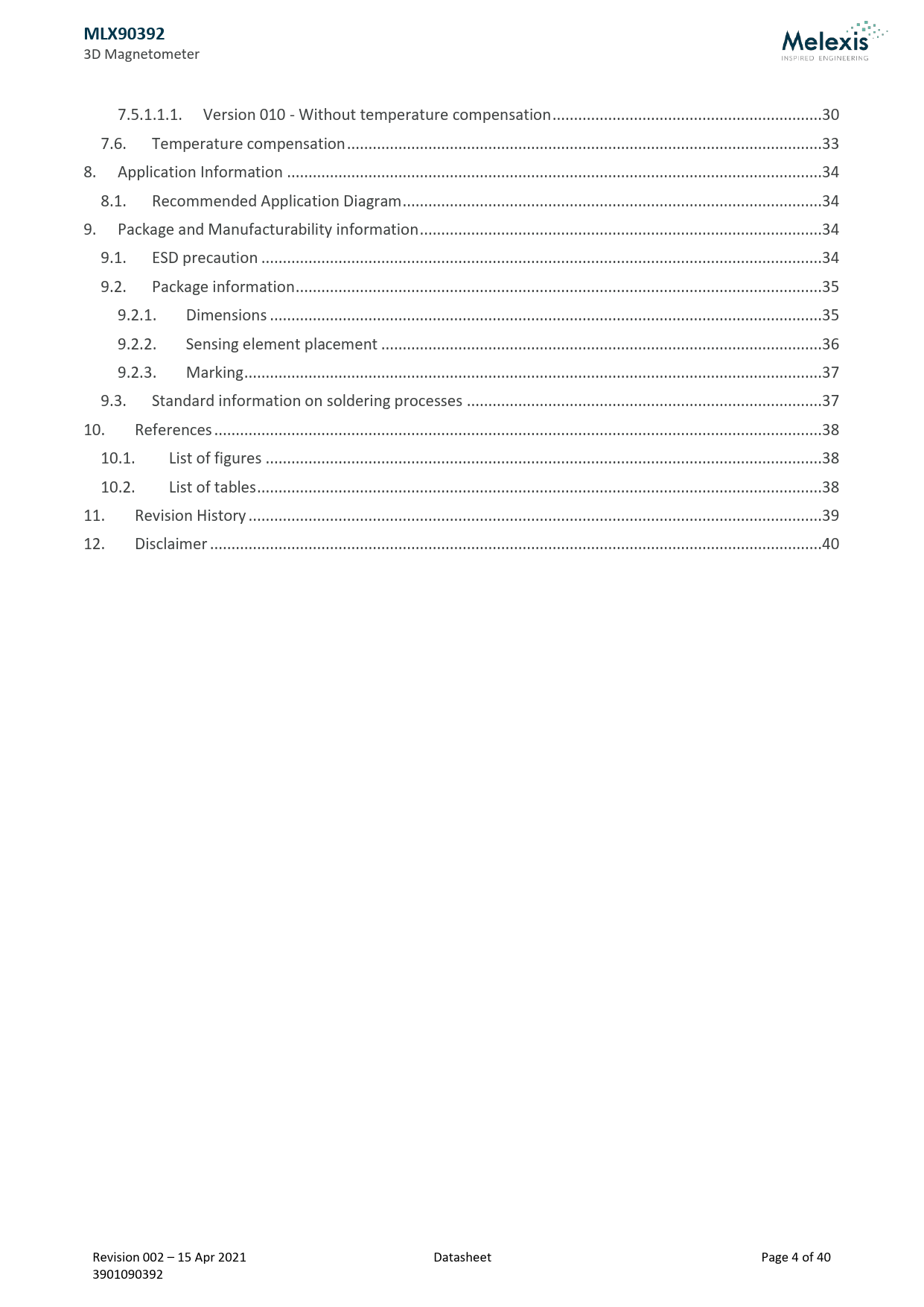 3D Magnetometer 7.5.1.1.1. Version 010 - Without temperature compensation ...30 7.6. Temperature compensation ...33 8. Application Information ...34 8.1. Recommended Application Diagram ..34 9. Package and Manufacturability information ..34 9.1. ESD precaution ...34 9.2. Package information ...35 9.2.1. Dimensions ...35 9.2.2. Sensing element placement ...36 9.2.3. Marking ...37 9.3. Standard information on soldering processes ...37 10. References ..38 10.1. List of figures ..38 10.2. List of tables ..38 11. Revision History ..39 12. Disclaimer ...40 Revision 002 – 15 Apr 2021 Datasheet Page 4 of 40 3901090392