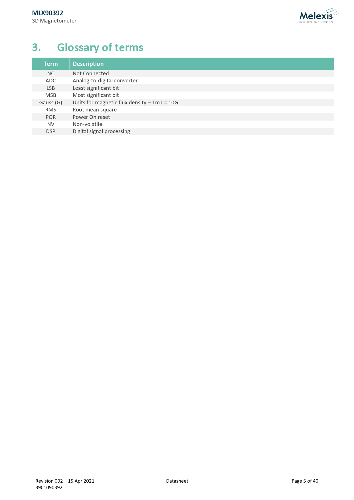 NC Not Connected ADC Analog-to-digital converter LSB Least significant bit MSB Most significant bit Gauss (G) Units for magnetic flux density – 1mT = 10G RMS Root mean square POR Power On reset NV Non-volatile DSP Digital signal processing Revision 002 – 15 Apr 2021 Datasheet Page 5 of 40 3901090392
