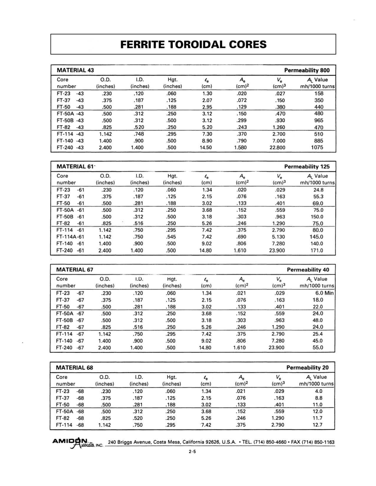 Datasheet FT-23-43, FT-37-43, FT-50-43, FT-50A-43, FT-50B-43, FT-82-43, FT-114-43, FT-140-43, FT-240-43 (Amidon)