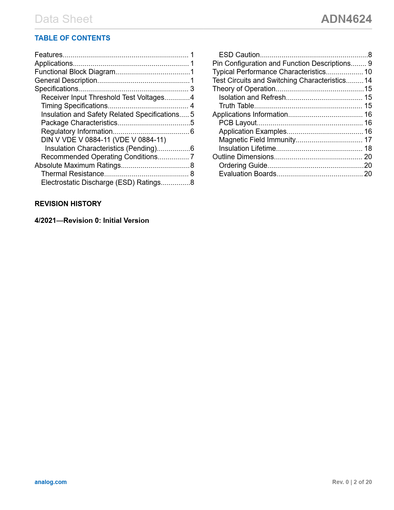link to page 1 link to page 1 link to page 1 link to page 1 link to page 3 link to page 4 link to page 4 link to page 5 link to page 5 link to page 6 link to page 6 link to page 6 link to page 7 link to page 8 link to page 8 link to page 8 link to page 8 link to page 9 link to page 10 link to page 14 link to page 15 link to page 15 link to page 15 link to page 16 link to page 16 link to page 16 link to page 17 link to page 18 link to page 20 link to page 20 link to page 20 Data Sheet ADN4624TABLE OF CONTENTS Features.. 1 ESD Caution...8 Applications... 1 Pin Configuration and Function Descriptions.. 9 Functional Block Diagram..1 Typical Performance Characteristics... 10 General Description...1 Test Circuits and Switching Characteristics...14 Specifications.. 3 Theory of Operation...15 Receiver Input Threshold Test Voltages...4 Isolation and Refresh... 15 Timing Specifications... 4 Truth Table... 15 Insulation and Safety Related Specifications... 5 Applications Information.. 16 Package Characteristics...5 PCB Layout.. 16 Regulatory Information... 6 Application Examples...16 DIN V VDE V 0884-11 (VDE V 0884-11) Magnetic Field Immunity.. 17 Insulation Characteristics (Pending)...6 Insulation Lifetime.. 18 Recommended Operating Conditions.. 7 Outline Dimensions... 20 Absolute Maximum Ratings...8 Ordering Guide...20 Thermal Resistance... 8 Evaluation Boards.. 20 Electrostatic Discharge (ESD) Ratings...8 REVISION HISTORY4/2021—Revision 0: Initial Versionanalog.comRev. 0 | 2 of 20 Document Outline Features Applications Functional Block Diagram General Description Specifications Receiver Input Threshold Test Voltages Timing Specifications Insulation and Safety Related Specifications Package Characteristics Regulatory Information DIN V VDE V 0884-11 (VDE V 0884-11) Insulation Characteristics (Pending) Recommended Operating Conditions Absolute Maximum Ratings Thermal Resistance Electrostatic Discharge (ESD) Ratings ESD Ratings for ADN4624 ESD Caution Pin Configuration and Function Descriptions Typical Performance Characteristics Test Circuits and Switching Characteristics Theory of Operation Isolation and Refresh Truth Table Applications Information PCB Layout Application Examples Magnetic Field Immunity Insulation Lifetime Surface Tracking Insulation Wear Out Calculation and Use of Parameters Example Outline Dimensions Ordering Guide Evaluation Boards