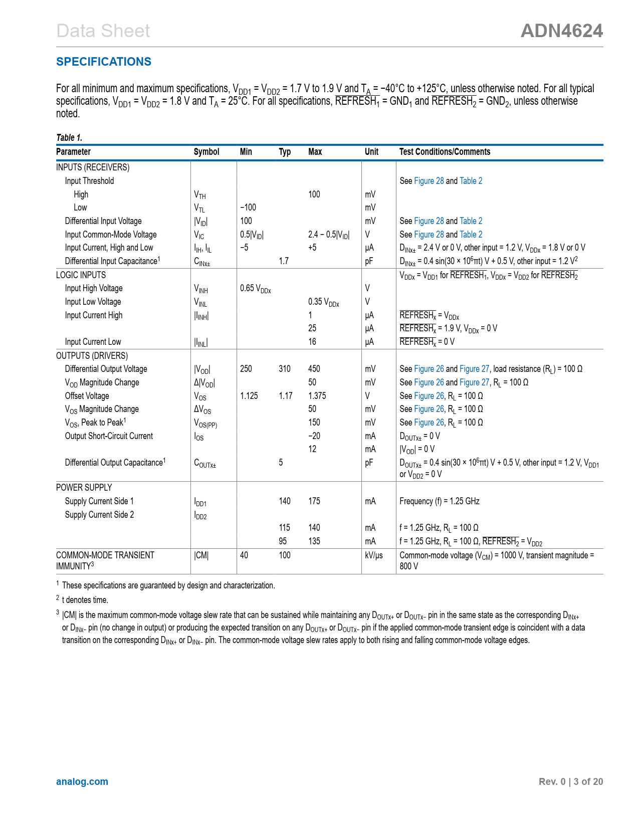 ADN4624. SPECIFICATIONS. Table 1. Parameter. Symbol. Min. Typ. Max. Unit. Test Conditions/Comments. analog.com. Rev. 0 | 3 of 20