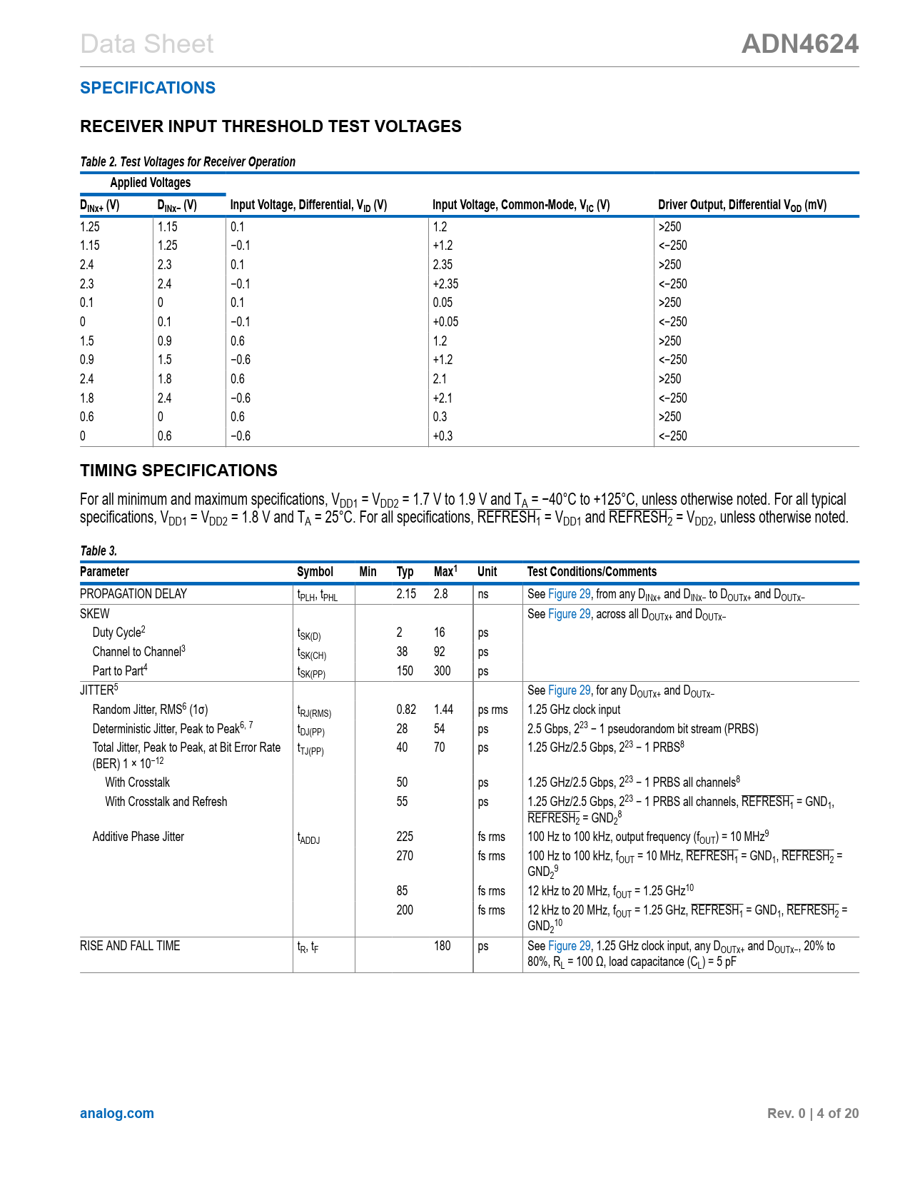 Páginas / Página20 / 4 — ADN4624. SPECIFICATIONS. RECEIVER INPUT THRESHOLD TEST VOLTAGES. Table 2. …