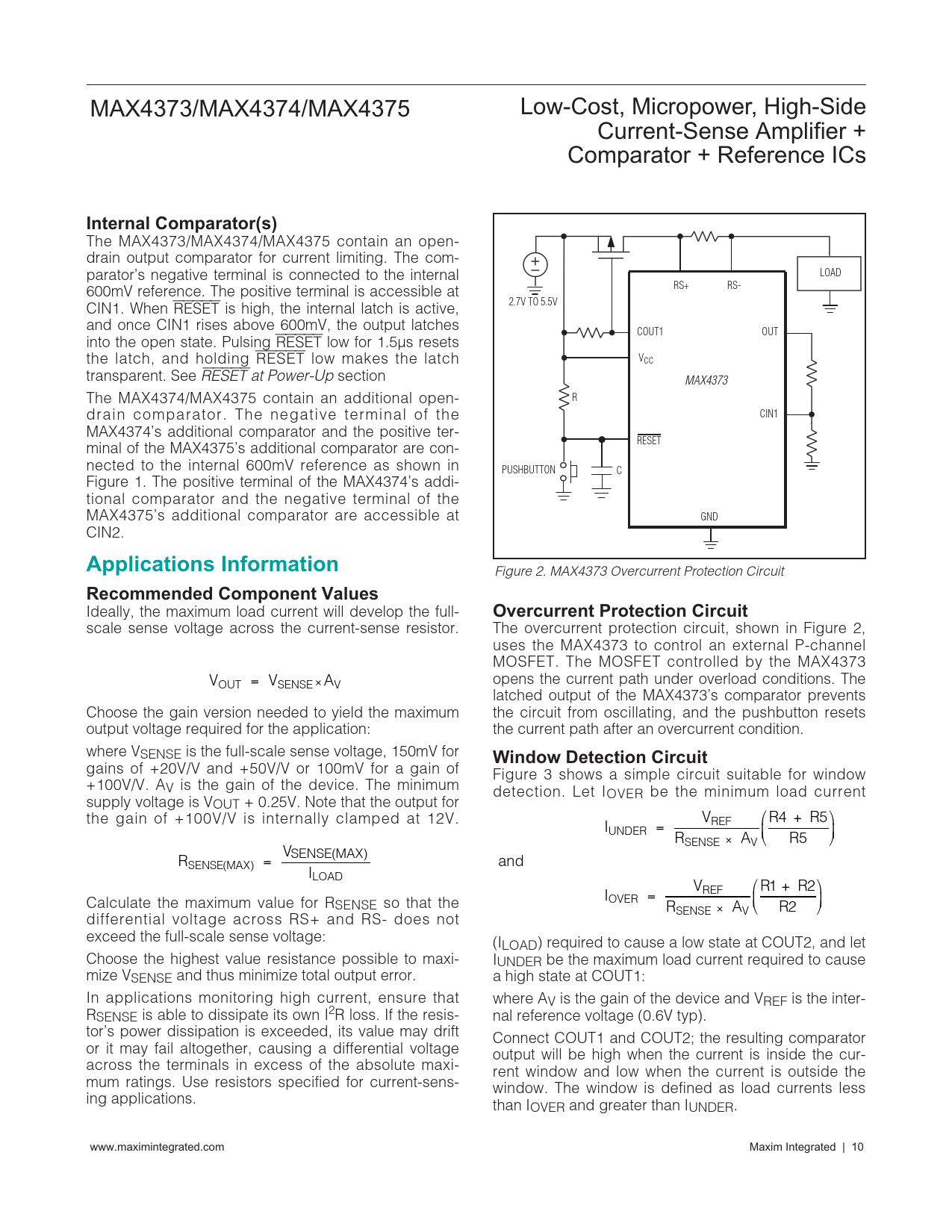 MAX4373/MAX4374/MAX4375 Low-Cost, Micropower, High-Side Current-Sense Amplifier + Comparator + Reference ICs Internal Comparator(s) The MAX4373/MAX4374/MAX4375 contain an open- drain output comparator for current limiting. The com- parator’s negative terminal is connected to the internal LOAD 600mV reference. The positive terminal is accessible at RS+ RS- CIN1. When RESET is high, the internal latch is active, 2.7V TO 5.5V and once CIN1 rises above 600mV, the output latches COUT1 OUT into the open state. Pulsing RESET low for 1.5µs resets the latch, and holding RESET low makes the latch VCC transparent. See RESET at Power-Up section MAX4373 The MAX4374/MAX4375 contain an additional open- R drain comparator. The negative terminal of the CIN1 MAX4374’s additional comparator and the positive ter- RESET minal of the MAX4375’s additional comparator are con- nected to the internal 600mV reference as shown in PUSHBUTTON C Figure 1. The positive terminal of the MAX4374’s addi- tional comparator and the negative terminal of the MAX4375’s additional comparator are accessible at GND CIN2. Applications Information Figure 2. MAX4373 Overcurrent Protection Circuit Recommended Component Values Ideally, the maximum load current will develop the full- Overcurrent Protection Circuit scale sense voltage across the current-sense resistor. The overcurrent protection circuit, shown in Figure 2, uses the MAX4373 to control an external P-channel MOSFET. The MOSFET controlled by the MAX4373 VOUT = VSENSE × A opens the current path under overload conditions. The V latched output of the MAX4373’s comparator prevents Choose the gain version needed to yield the maximum the circuit from oscillating, and the pushbutton resets output voltage required for the application: the current path after an overcurrent condition. where VSENSE is the full-scale sense voltage, 150mV for Window Detection Circuit gains of +20V/V and +50V/V or 100mV for a gain of Figure 3 shows a simple circuit suitable for window +100V/V. AV is the gain of the device. The minimum detection. Let IOVER be the minimum load current supply voltage is VOUT + 0.25V. Note that the output for the gain of +100V/V is internally clamped at 12V. VREF ⎛ R4 R5⎞ IUNDER = + R SENSE × AV ⎝ ⎜ R5 ⎠⎟ VSENSE MAX ( ) RSENSE MAX ( ) = and ILOAD VREF ⎛ R 1 R2 ⎞ IOVER = + Calculate the maximum value for RSENSE so that the R SENSE × AV ⎝ ⎜ R2 ⎠⎟ differential voltage across RS+ and RS- does not exceed the full-scale sense voltage: (ILOAD) required to cause a low state at COUT2, and let Choose the highest value resistance possible to maxi- IUNDER be the maximum load current required to cause mize VSENSE and thus minimize total output error. a high state at COUT1: In applications monitoring high current, ensure that where AV is the gain of the device and VREF is the inter- RSENSE is able to dissipate its own I2R loss. If the resis- nal reference voltage (0.6V typ). tor’s power dissipation is exceeded, its value may drift Connect COUT1 and COUT2; the resulting comparator or it may fail altogether, causing a differential voltage output will be high when the current is inside the cur- across the terminals in excess of the absolute maxi- rent window and low when the current is outside the mum ratings. Use resistors specified for current-sens- window. The window is defined as load currents less ing applications. than IOVER and greater than IUNDER. www.maximintegrated.com Maxim Integrated | 10