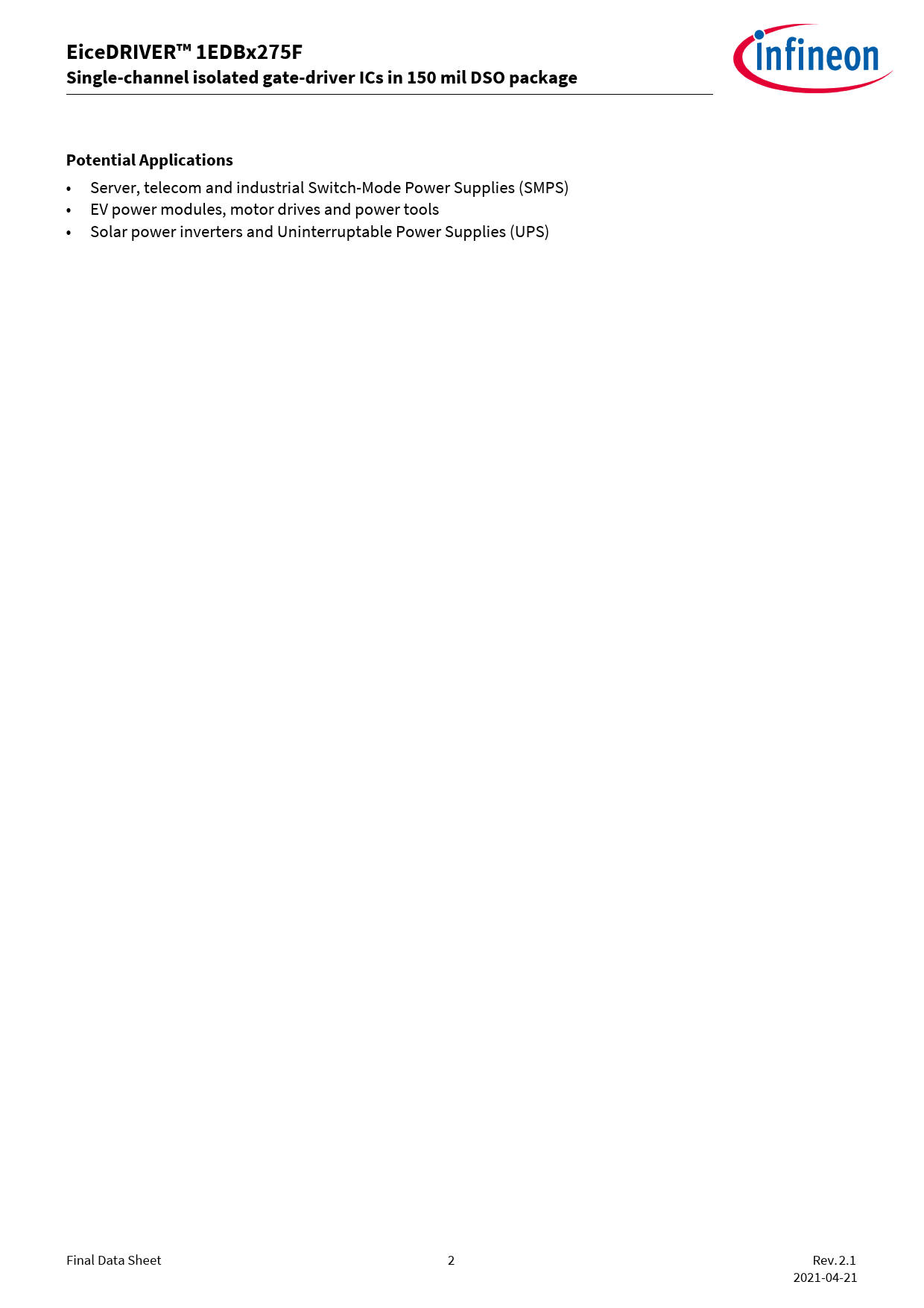 • Server, telecom and industrial Switch-Mode Power Supplies (SMPS) • EV power modules, motor drives and power tools • Solar power inverters and Uninterruptable Power Supplies (UPS) Final Data Sheet 2 Rev. 2.1 2021-04-21 Document Outline Description Table of Contents 1 Pin configuration and description 2 Functional description 2.1 Block diagram 2.2 Power supply and Undervoltage Lockout (UVLO) 2.2.1 Input supply voltage 2.2.2 Output supply voltage 2.2.3 Input stage 2.3 Driver output 2.4 Output active clamping 2.5 CT communication and input to output data transmission 3 Electrical characteristics and parameters 3.1 Absolute maximum ratings 3.2 Thermal characteristics 3.3 Operating range 3.4 Electrical characteristics 3.5 Isolation specifications 4 Timing diagrams 5 Layout recommendation 6 Application notes 6.1 Driving 600 V CoolGaNTM 6.2 Driving 650 V CoolSiCTM 7 Typical characteristics 8 Package outline dimensions 8.1 Device numbers and markings 8.2 Package PG-DSO-8 Revision history