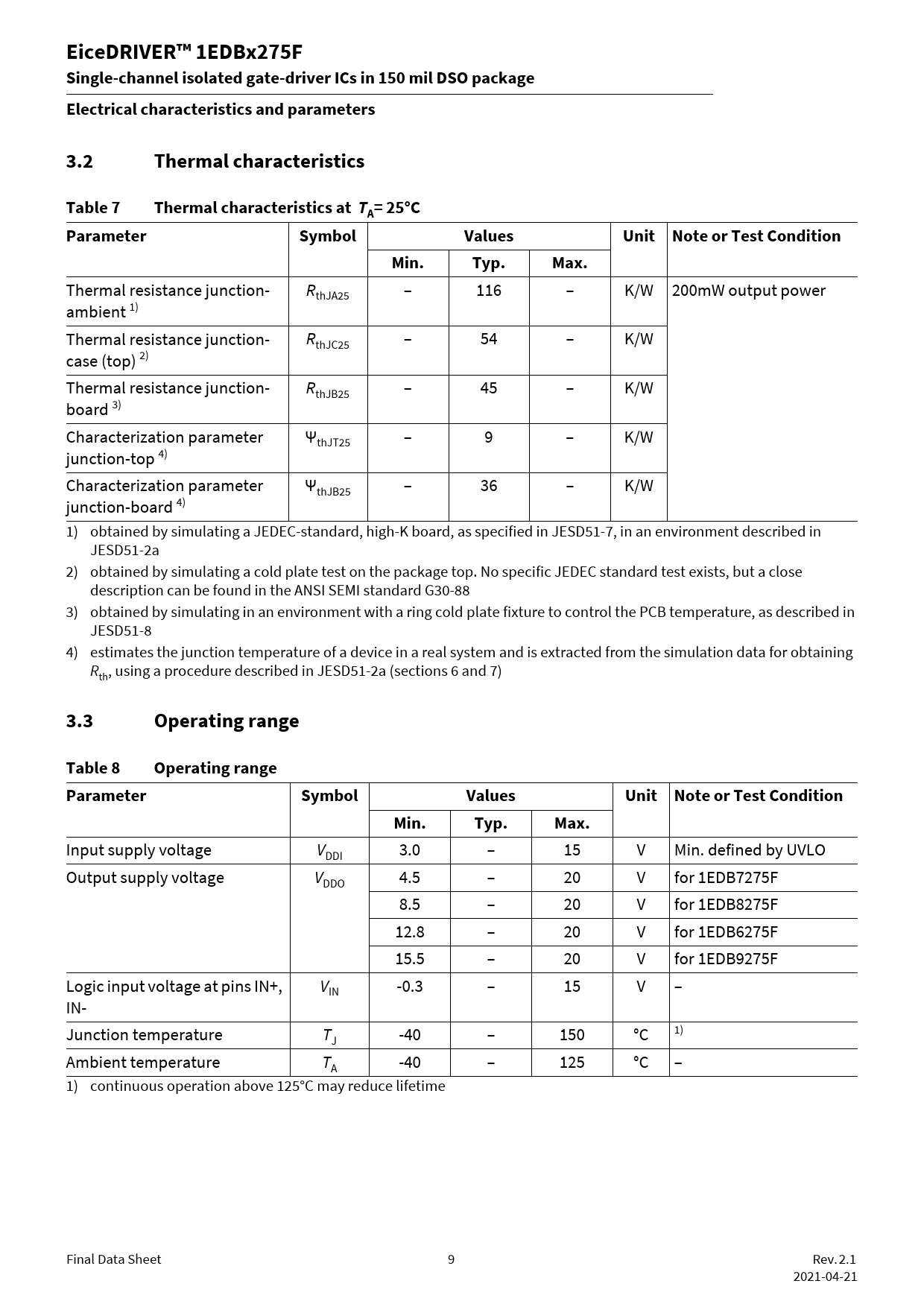Input supply voltage VDDI 3.0 – 15 V Min. defined by UVLO Output supply voltage VDDO 4.5 – 20 V for 1EDB7275F 8.5 – 20 V for 1EDB8275F 12.8 – 20 V for 1EDB6275F 15.5 – 20 V for 1EDB9275F Logic input voltage at pins IN+, VIN -0.3 – 15 V – IN- Junction temperature TJ -40 – 150 °C 1) Ambient temperature TA -40 – 125 °C – 1) continuous operation above 125°C may reduce lifetime Final Data Sheet 9 Rev. 2.1 2021-04-21 Document Outline Description Table of Contents 1 Pin configuration and description 2 Functional description 2.1 Block diagram 2.2 Power supply and Undervoltage Lockout (UVLO) 2.2.1 Input supply voltage 2.2.2 Output supply voltage 2.2.3 Input stage 2.3 Driver output 2.4 Output active clamping 2.5 CT communication and input to output data transmission 3 Electrical characteristics and parameters 3.1 Absolute maximum ratings 3.2 Thermal characteristics 3.3 Operating range 3.4 Electrical characteristics 3.5 Isolation specifications 4 Timing diagrams 5 Layout recommendation 6 Application notes 6.1 Driving 600 V CoolGaNTM 6.2 Driving 650 V CoolSiCTM 7 Typical characteristics 8 Package outline dimensions 8.1 Device numbers and markings 8.2 Package PG-DSO-8 Revision history