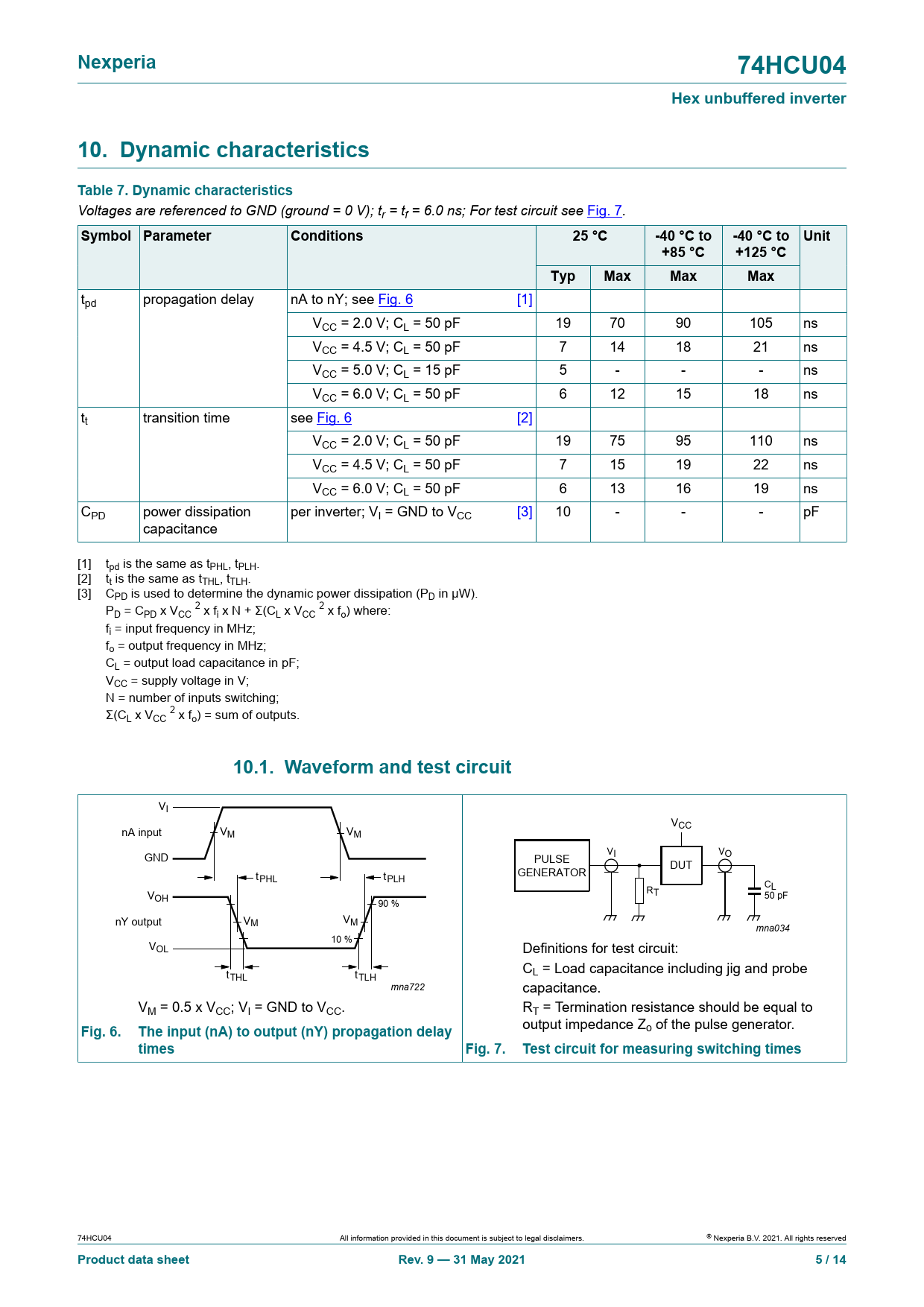 Nexperia. 74HCU04. Hex unbuffered inverter. 10. Dynamic characteristics Table 7. Dynamic characteristics. Symbol Parameter