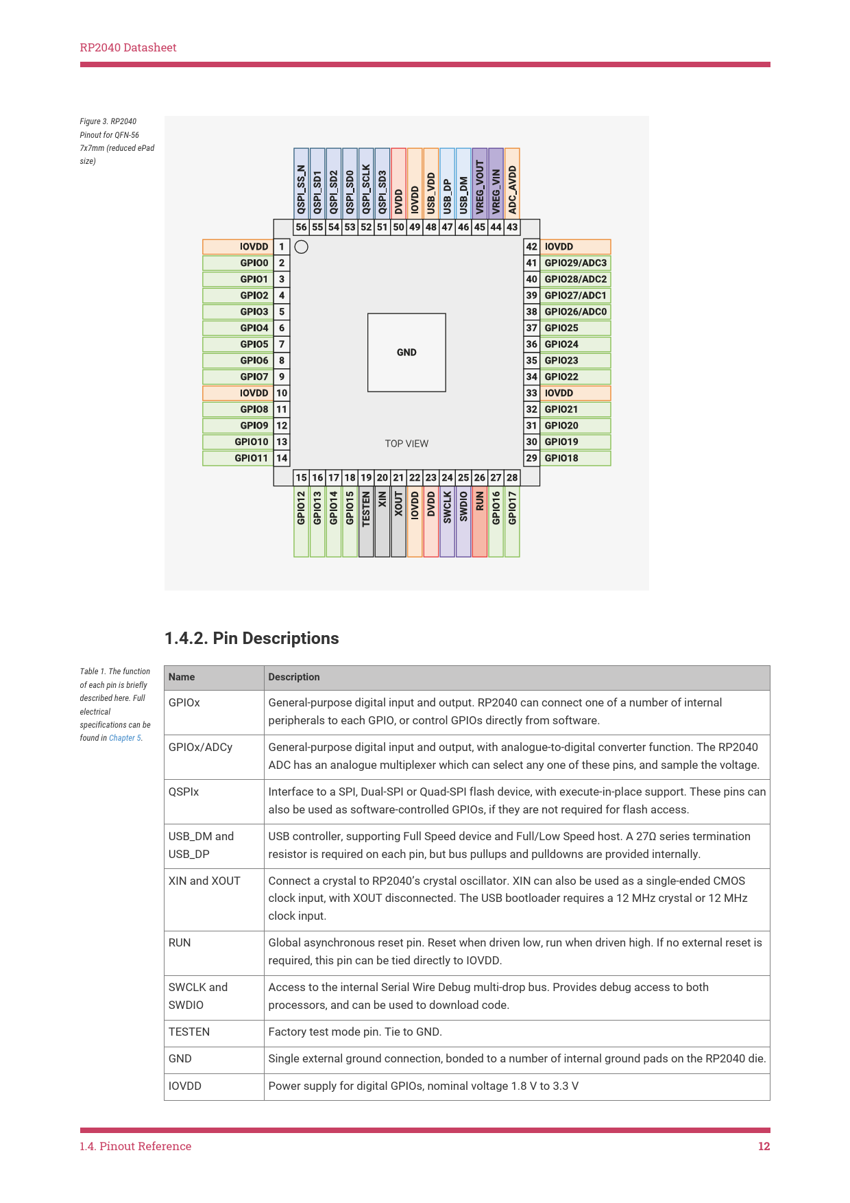 link to page 627 RP2040 Datasheet Figure 3. RP2040 Pinout for QFN-56 7x7mm (reduced ePad size) 1.4.2. Pin Descriptions Table 1. The function NameDescription of each pin is briefly described here. Full GPIOx General-purpose digital input and output. RP2040 can connect one of a number of internal electrical specifications can be peripherals to each GPIO, or control GPIOs directly from software. found in Chapter 5. GPIOx/ADCy General-purpose digital input and output, with analogue-to-digital converter function. The RP2040 ADC has an analogue multiplexer which can select any one of these pins, and sample the voltage. QSPIx Interface to a SPI, Dual-SPI or Quad-SPI flash device, with execute-in-place support. These pins can also be used as software-controlled GPIOs, if they are not required for flash access. USB_DM and USB controller, supporting Full Speed device and Full/Low Speed host. A 27Ω series termination USB_DP resistor is required on each pin, but bus pullups and pulldowns are provided internally. XIN and XOUT Connect a crystal to RP2040’s crystal oscillator. XIN can also be used as a single-ended CMOS clock input, with XOUT disconnected. The USB bootloader requires a 12 MHz crystal or 12 MHz clock input. RUN Global asynchronous reset pin. Reset when driven low, run when driven high. If no external reset is required, this pin can be tied directly to IOVDD. SWCLK and Access to the internal Serial Wire Debug multi-drop bus. Provides debug access to both SWDIO processors, and can be used to download code. TESTEN Factory test mode pin. Tie to GND. GND Single external ground connection, bonded to a number of internal ground pads on the RP2040 die. IOVDD Power supply for digital GPIOs, nominal voltage 1.8 V to 3.3 V 1.4. Pinout Reference 12 Document Outline RP2040 Datasheet Colophon Legal Disclaimer Notice Table of Contents Chapter 1. Introduction 1.1. Why is the chip called RP2040? 1.2. Summary 1.3. The Chip 1.4. Pinout Reference 1.4.1. Pin Locations 1.4.2. Pin Descriptions 1.4.3. GPIO Functions Chapter 2. System Description 2.1. Bus Fabric 2.1.1. AHB-Lite Crossbar 2.1.2. Atomic Register Access 2.1.3. APB Bridge 2.1.4. Narrow IO Register Writes 2.1.5. List of Registers 2.2. Address Map 2.2.1. Summary 2.2.2. Detail 2.3. Processor subsystem 2.3.1. SIO 2.3.2. Interrupts 2.3.3. Event Signals 2.3.4. Debug 2.4. Cortex-M0+ 2.4.1. Features 2.4.2. Functional Description 2.4.3. Programmer’s model 2.4.4. System control 2.4.5. NVIC 2.4.6. MPU 2.4.7. Debug 2.4.8. List of Registers 2.5. DMA 2.5.1. Configuring Channels 2.5.2. Starting Channels 2.5.3. Data Request (DREQ) 2.5.4. Interrupts 2.5.5. Additional Features 2.5.6. Example Use Cases 2.5.7. List of Registers 2.6. Memory 2.6.1. ROM 2.6.2. SRAM 2.6.3. Flash 2.7. Boot Sequence 2.8. Bootrom 2.8.1. Processor Controlled Boot Sequence 2.8.2. Bootrom Contents 2.8.3. USB Mass Storage Interface 2.8.4. USB PICOBOOT Interface 2.9. Power Supplies 2.9.1. Digital IO Supply (IOVDD) 2.9.2. Digital Core Supply (DVDD) 2.9.3. On-Chip Voltage Regulator Input Supply (VREG_VIN) 2.9.4. USB PHY Supply (USB_VDD) 2.9.5. ADC Supply (ADC_AVDD) 2.9.6. Power Supply Sequencing 2.9.7. Power Supply Schemes 2.10. Core Supply Regulator 2.10.1. Application Circuit 2.10.2. Operating Modes 2.10.3. Output Voltage Select 2.10.4. Status 2.10.5. Current Limit 2.10.6. List of Registers 2.10.7. Detailed Specifications 2.11. Power Control 2.11.1. Top-level Clock Gates 2.11.2. SLEEP State 2.11.3. DORMANT State 2.11.4. Memory Power Down 2.11.5. Programmer’s Model 2.12. Chip-Level Reset 2.12.1. Overview 2.12.2. Power-on Reset 2.12.3. Brown-out Detection 2.12.4. Supply Monitor 2.12.5. External Reset 2.12.6. Rescue Debug Port Reset 2.12.7. Source of Last Reset 2.12.8. List of Registers 2.13. Power-On State Machine 2.13.1. Overview 2.13.2. Power On Sequence 2.13.3. Register Control 2.13.4. Interaction with Watchdog 2.13.5. List of Registers 2.14. Subsystem Resets 2.14.1. Overview 2.14.2. Programmer’s Model 2.14.3. List of Registers 2.15. Clocks 2.15.1. Overview 2.15.2. Clock sources 2.15.3. Clock Generators 2.15.4. Frequency Counter 2.15.5. Resus 2.15.6. Programmer’s Model 2.15.7. List of Registers 2.16. Crystal Oscillator (XOSC) 2.16.1. Overview 2.16.2. Usage 2.16.3. Startup Delay 2.16.4. XOSC Counter 2.16.5. DORMANT mode 2.16.6. Programmer’s Model 2.16.7. List of Registers 2.17. Ring Oscillator (ROSC) 2.17.1. Overview 2.17.2. ROSC/XOSC trade-offs 2.17.3. Modifying the frequency 2.17.4. ROSC divider 2.17.5. Random Number Generator 2.17.6. ROSC Counter 2.17.7. DORMANT mode 2.17.8. List of Registers 2.18. PLL 2.18.1. Overview 2.18.2. Calculating PLL parameters 2.18.3. Configuration 2.18.4. List of Registers 2.19. GPIO 2.19.1. Overview 2.19.2. Function Select 2.19.3. Interrupts 2.19.4. Pads 2.19.5. Software Examples 2.19.6. List of Registers 2.20. Sysinfo 2.20.1. Overview 2.20.2. List of Registers 2.21. Syscfg 2.21.1. Overview 2.21.2. List of Registers 2.22. TBMAN 2.22.1. List of Registers Chapter 3. PIO 3.1. Overview 3.2. Programmer’s Model 3.2.1. PIO Programs 3.2.2. Control Flow 3.2.3. Registers 3.2.4. Stalling 3.2.5. Pin Mapping 3.2.6. IRQ Flags 3.2.7. Interactions Between State Machines 3.3. PIO Assembler (pioasm) 3.3.1. Directives 3.3.2. Values 3.3.3. Expressions 3.3.4. Comments 3.3.5. Labels 3.3.6. Instructions 3.3.7. Pseudoinstructions 3.4. Instruction Set 3.4.1. Summary 3.4.2. JMP 3.4.3. WAIT 3.4.4. IN 3.4.5. OUT 3.4.6. PUSH 3.4.7. PULL 3.4.8. MOV 3.4.9. IRQ 3.4.10. SET 3.5. Functional Details 3.5.1. Side-set 3.5.2. Program Wrapping 3.5.3. FIFO Joining 3.5.4. Autopush and Autopull 3.5.5. Clock Dividers 3.5.6. GPIO Mapping 3.5.7. Forced and EXEC’d Instructions 3.6. Examples 3.6.1. Duplex SPI 3.6.2. WS2812 LEDs 3.6.3. UART TX 3.6.4. UART RX 3.6.5. Manchester Serial TX and RX 3.6.6. Differential Manchester (BMC) TX and RX 3.6.7. I2C 3.6.8. PWM 3.6.9. Addition 3.6.10. Further Examples 3.7. List of Registers Chapter 4. Peripherals 4.1. USB 4.1.1. Overview 4.1.2. Architecture 4.1.3. 