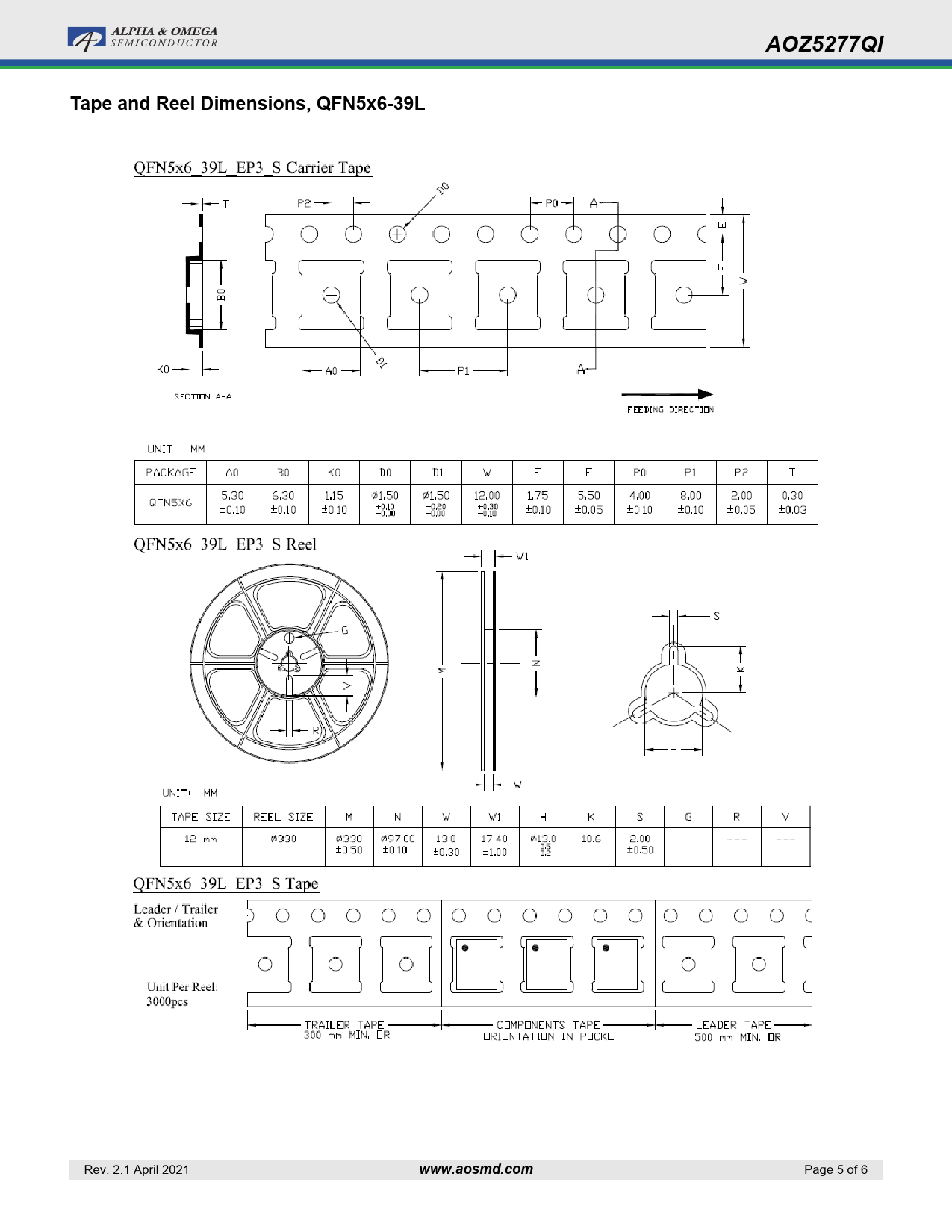 | Páginas / Página | 6 / 5 — AOZ5277QI. Tape and Reel Dimensions, QFN5x6-39L. www.aosmd.com |