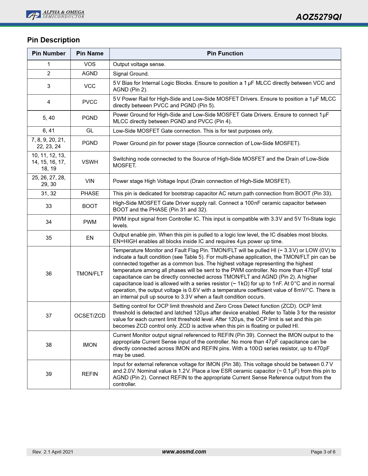 AOZ5279QI. Pin Description. Pin Number. Pin Name. Pin Function. www.aosmd.com