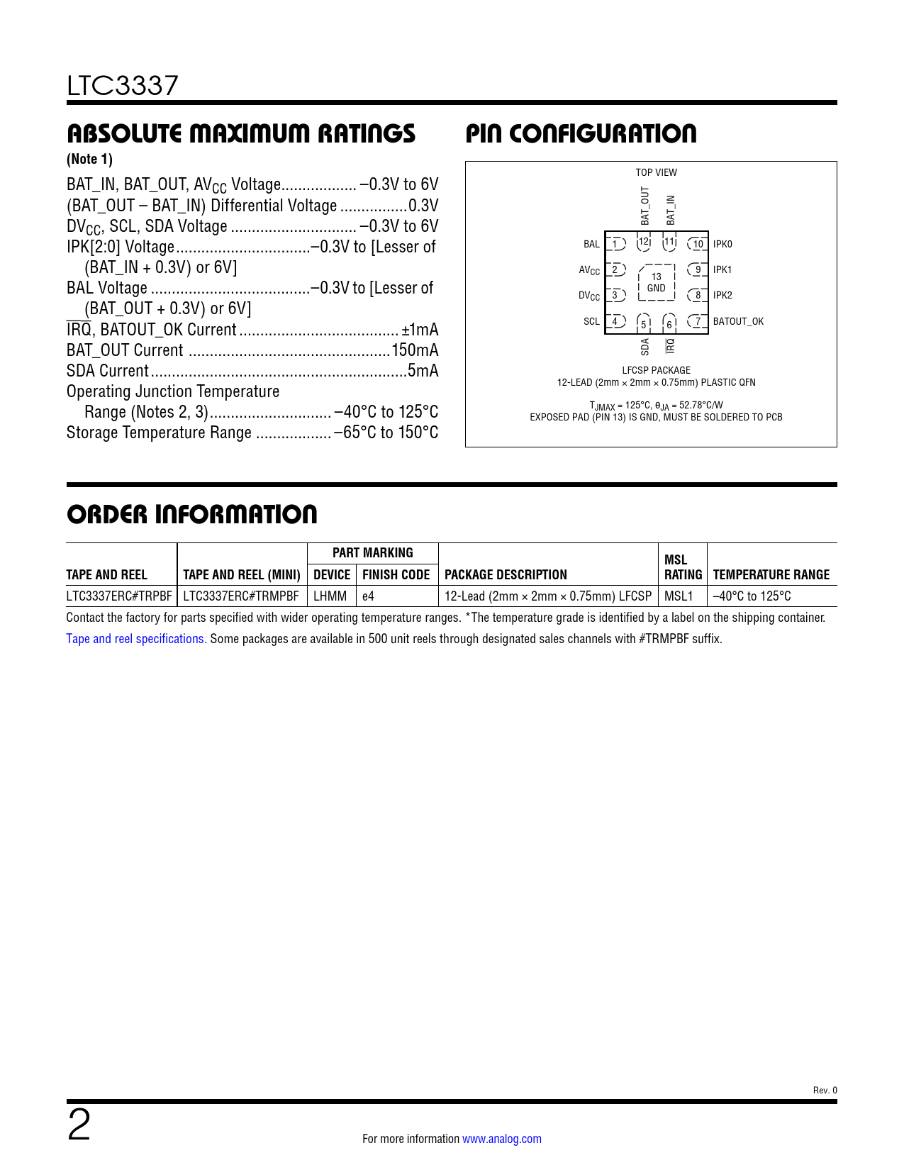 LTC3337ERC#TRPBF LTC3337ERC#TRMPBF LHMM e4 12-Lead (2mm × 2mm × 0.75mm) LFCSP MSL1 –40°C to 125°C Contact the factory for parts specified with wider operating temperature ranges. *The temperature grade is identified by a label on the shipping container. Tape and reel specifications. Some packages are available in 500 unit reels through designated sales channels with #TRMPBF suffix. Rev. 0 2 For more information www.analog.com Document Outline Features Applications Typical Application Description Absolute Maximum Ratings Order Information Electrical Characteristics Timing Diagram Typical Performance Characteristics Pin Functions Block Diagram Operation Applications Information Typical Applications Package Description Typical Applications Related Parts