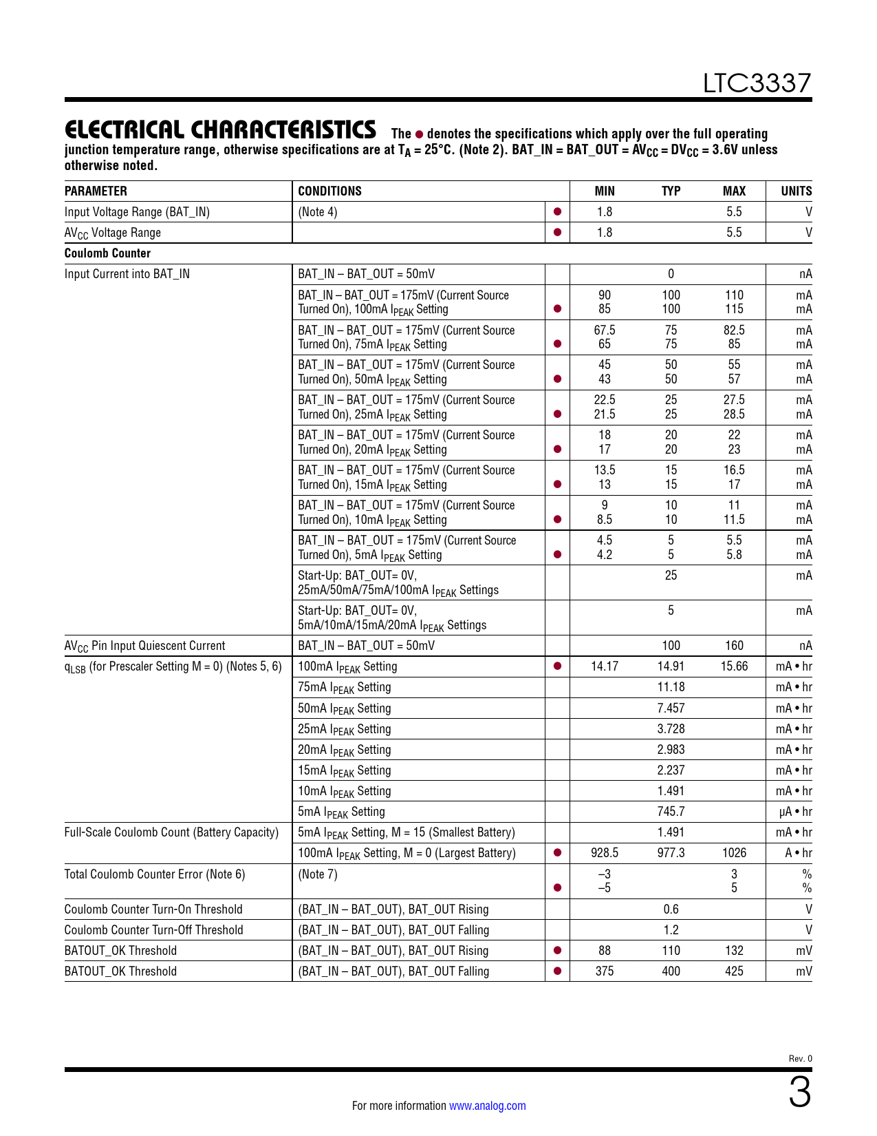 Input Current into BAT_IN BAT_IN – BAT_OUT = 50mV 0 nA BAT_IN – BAT_OUT = 175mV (Current Source 90 100 110 mA Turned On), 100mA IPEAK Setting l 85 100 115 mA BAT_IN – BAT_OUT = 175mV (Current Source 67.5 75 82.5 mA Turned On), 75mA IPEAK Setting l 65 75 85 mA BAT_IN – BAT_OUT = 175mV (Current Source 45 50 55 mA Turned On), 50mA IPEAK Setting l 43 50 57 mA BAT_IN – BAT_OUT = 175mV (Current Source 22.5 25 27.5 mA Turned On), 25mA IPEAK Setting l 21.5 25 28.5 mA BAT_IN – BAT_OUT = 175mV (Current Source 18 20 22 mA Turned On), 20mA IPEAK Setting l 17 20 23 mA BAT_IN – BAT_OUT = 175mV (Current Source 13.5 15 16.5 mA Turned On), 15mA IPEAK Setting l 13 15 17 mA BAT_IN – BAT_OUT = 175mV (Current Source 9 10 11 mA Turned On), 10mA IPEAK Setting l 8.5 10 11.5 mA BAT_IN – BAT_OUT = 175mV (Current Source 4.5 5 5.5 mA Turned On), 5mA IPEAK Setting l 4.2 5 5.8 mA Start-Up: BAT_OUT= 0V, 25 mA 25mA/50mA/75mA/100mA IPEAK Settings Start-Up: BAT_OUT= 0V, 5 mA 5mA/10mA/15mA/20mA IPEAK Settings AVCC Pin Input Quiescent Current BAT_IN – BAT_OUT = 50mV 100 160 nA qLSB (for Prescaler Setting M = 0) (Notes 5, 6) 100mA IPEAK Setting l 14.17 14.91 15.66 mA • hr 75mA IPEAK Setting 11.18 mA • hr 50mA IPEAK Setting 7.457 mA • hr 25mA IPEAK Setting 3.728 mA • hr 20mA IPEAK Setting 2.983 mA • hr 15mA IPEAK Setting 2.237 mA • hr 10mA IPEAK Setting 1.491 mA • hr 5mA IPEAK Setting 745.7 µA • hr Full-Scale Coulomb Count (Battery Capacity) 5mA IPEAK Setting, M = 15 (Smallest Battery) 1.491 mA • hr 100mA IPEAK Setting, M = 0 (Largest Battery) l 928.5 977.3 1026 A • hr Total Coulomb Counter Error (Note 6) (Note 7) –3 3 % l –5 5 % Coulomb Counter Turn-On Threshold (BAT_IN – BAT_OUT), BAT_OUT Rising 0.6 V Coulomb Counter Turn-Off Threshold (BAT_IN – BAT_OUT), BAT_OUT Falling 1.2 V BATOUT_OK Threshold (BAT_IN – BAT_OUT), BAT_OUT Rising l 88 110 132 mV BATOUT_OK Threshold (BAT_IN – BAT_OUT), BAT_OUT Falling l 375 400 425 mV Rev. 0 For more information www.analog.com 3 Document Outline Features Applications Typical Application Description Absolute Maximum Ratings Order Information Electrical Characteristics Timing Diagram Typical Performance Characteristics Pin Functions Block Diagram Operation Applications Information Typical Applications Package Description Typical Applications Related Parts