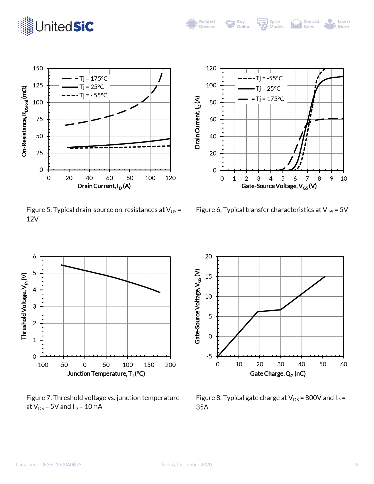 150 120 Tj = 175°C Tj = -55°C ) 125 100 W Tj = 25°C Tj = 25°C (m Tj = - 55°C ) Tj = 175°C n) A( o 100 80 (S I , D R D , nt e 75 c er 60 r ant Cu is s 50 n 40 e ai R r - D 25 On 20 0 0 0 20 40 60 80 100 120 0 1 2 3 4 5 6 7 8 9 10 Drain Current, ID (A) Gate-Source Voltage, VGS (V) Figure 5. Typical drain-source on-resistances at VGS = Figure 6. Typical transfer characteristics at VDS = 5V 12V 6 20 ) 5 V V ( 15 V th V GS , 4 , e e g g 10 lta lta o 3 o V V d ec ol r 5 h 2 s ou e S r - Th te 0 1 Ga 0 -5 -100 -50 0 50 100 150 200 0 10 20 30 40 50 60 Junction Temperature, TJ (°C) Gate Charge, QG (nC) Figure 7. Threshold voltage vs. junction temperature Figure 8. Typical gate charge at VDS = 800V and ID = at VDS = 5V and ID = 10mA 35A Datasheet: UF3SC120040B7S Rev. A, December 2020 6