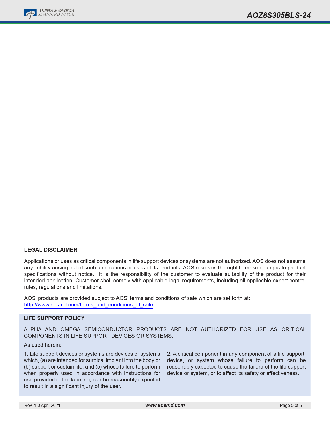 Páginas / Página5 / 5 — ALPHA & OMEGA. AOZ8S305BLS-24. LEGAL DISCLAIMER. LIFE SUPPORT POLICY. …