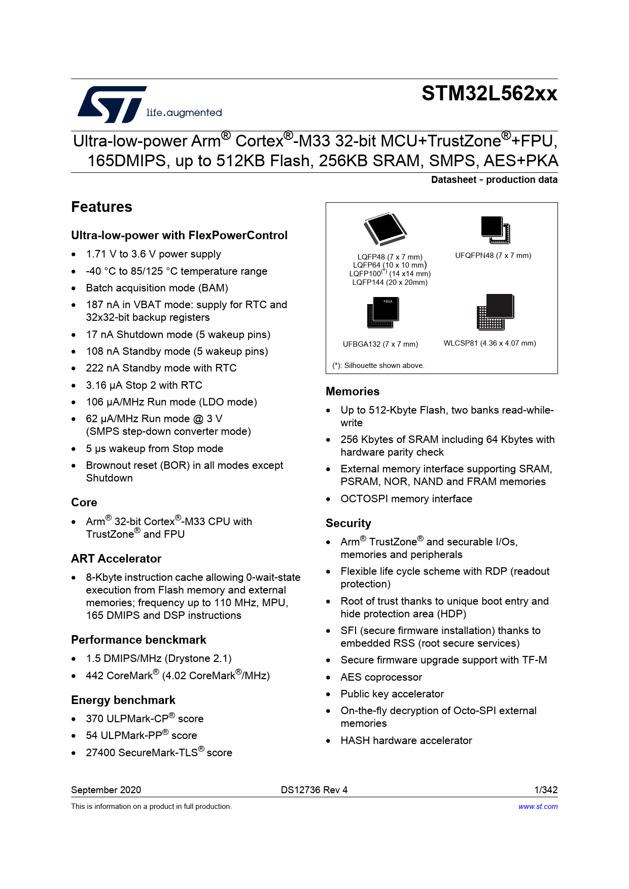STM32L562xx Ultra-low-power Arm® Cortex®-M33 32-bit MCU+TrustZone®+FPU, 165DMIPS, up to 512KB Flash, 256KB SRAM, SMPS, AES+PKA Datasheet - production dataFeaturesUltra-low-power with FlexPowerControl • 1.71 V to 3.6 V power supply LQFP48 (7 x 7 mm) UFQFPN48 (7 x 7 mm) • -40 °C to 85/125 °C temperature range LQFP64 (10 x 10 mm) LQFP100(*) (14 x14 mm) • Batch acquisition mode (BAM) LQFP144 (20 x 20mm) • 187 nA in VBAT mode: supply for RTC and FBGA 32x32-bit backup registers • 17 nA Shutdown mode (5 wakeup pins) UFBGA132 (7 x 7 mm) WLCSP81 (4.36 x 4.07 mm) • 108 nA Standby mode (5 wakeup pins) • 222 nA Standby mode with RTC (*): Silhouette shown above. • 3.16 μA Stop 2 with RTC Memories • 106 μA/MHz Run mode (LDO mode) • Up to 512-Kbyte Flash, two banks read-while- • 62 μA/MHz Run mode @ 3 V write (SMPS step-down converter mode) • 256 Kbytes of SRAM including 64 Kbytes with • 5 µs wakeup from Stop mode hardware parity check • Brownout reset (BOR) in all modes except • External memory interface supporting SRAM, Shutdown PSRAM, NOR, NAND and FRAM memories Core • OCTOSPI memory interface • Arm® 32-bit Cortex®-M33 CPU with Security TrustZone® and FPU • Arm® TrustZone® and securable I/Os, ART Accelerator memories and peripherals • 8-Kbyte instruction cache allowing 0-wait-state • Flexible life cycle scheme with RDP (readout execution from Flash memory and external protection) memories; frequency up to 110 MHz, MPU, • Root of trust thanks to unique boot entry and 165 DMIPS and DSP instructions hide protection area (HDP) • SFI (secure firmware installation) thanks to Performance benckmark embedded RSS (root secure services) • 1.5 DMIPS/MHz (Drystone 2.1) • Secure firmware upgrade support with TF-M • 442 CoreMark® (4.02 CoreMark®/MHz) • AES coprocessor Energy benchmark • Public key accelerator • On-the-fly decryption of Octo-SPI external • 370 ULPMark-CP® score memories • 54 ULPMark-PP® score • HASH hardware accelerator • 27400 SecureMark-TLS® score September 2020 DS12736 Rev 4 1/342 This is information on a product in full production. www.st.com Document Outline Table 1. Device summary 1 Introduction 2 Description Table 2. STM32L562xx features and peripheral counts Figure 1. STM32L562xx block diagram 3 Functional overview 3.1 Arm® Cortex®-M33 core with TrustZone® and FPU 3.2 Art Accelerator – instruction cache (ICACHE) 3.3 Memory protection unit 3.4 Embedded Flash memory 3.5 Embedded SRAM 3.6 Boot modes Table 3. Boot modes when TrustZone is disabled (TZEN=0) Table 4. Boot modes when TrustZone is enabled (TZEN=1) Table 5. Boot space versus RDP protection 3.7 Global TrustZone controller (GTZC) 3.8 TrustZone security architecture Table 6. Example of memory map security attribution vs SAU configuration regions 3.8.1 TrustZone peripheral classification Table 7. Securable peripherals by TZSC (continued) Table 8. TrustZone-aware peripherals 3.9 Power supply management 3.9.1 Power supply schemes Figure 2. STM32L562xx power supply overview Figure 3. STM32L562xxxxP power supply overview Figure 4. STM32L562xxxxQ power supply overview Figure 5. Power-up/down sequence 3.9.2 Power supply supervisor 3.9.3 Voltage regulator 3.9.4 SMPS step down converter Figure 6. SMPS step down converter power supply scheme Table 9. SMPS external components 3.9.5 Low-power modes Table 10. STM32L562xx modes overview Table 11. Functionalities depending on the working mode 3.9.6 Reset mode 3.9.7 VBAT operation 3.9.8 PWR TrustZone security 3.10 Peripheral interconnect matrix Table 12. STM32L562xx peripherals interconnect matrix 3.11 Reset and clock controller (RCC) Figure 7. STM32L562xx clock tree 3.12 Clock recovery system (CRS) 3.13 General-purpose inputs/outputs (GPIOs) 3.14 Multi-AHB bus matrix Figure 8. Multi-AHB bus matrix 3.15 Direct memory access controller (DMA) Table 13. DMA1 and DMA2 implementation 3.16 DMA request router (DMAMUX) 3.17 Interrupts and events 3.17.1 Nested vectored interrupt controller (NVIC) 3.17.2 Extended interrupt/event controller (EXTI) 3.18 Cyclic redundancy check calculation unit (CRC) 3.19 Flexible static memory controller (FSMC) 3.20 Octo-SPI interface (OCTOSPI) 3.21 Analog-to-digital converter (ADC) 3.21.1 Temperature sensor Table 14. Temperature sensor calibration values 3.21.2 Internal voltage reference (VREFINT) Table 15. Internal voltage reference calibration values 3.21.3 VBAT battery voltage monitoring 3.22 Digital to analog converter (DAC) 3.23 Voltage reference buffer (VREFBUF) Figure 9. Voltage reference buffer 3.24 Comparators (COMP) 3.25 Operational amplifier (OPAMP) 3.26 Digital filter for sigma-delta modulators (DFSDM) 3.27 Touch sensing controller (TSC) 3.28 True random number generator (RNG) 3.29 Advanced encryption standard hardware accelerator (AES) 3.30 HASH hardware accelerator (HASH) 3.31 Public key accelerator PKA 3.32 On-the-fly decryption engine (OTFDEC) 3.33 Timers and watchdogs Table 16. Timer feature comparison 3.33.1 Advanced-control timer (TIM1, TIM8) 3.33.2 General-purpose timers (TIM2, TIM3, TIM4, TIM5, TIM15, TIM16, TIM17) 3.33.3 Basic timers (TIM6 and TIM7) 3.33.4 Low-power timers (LPTIM1, LPTIM2 and LPTIM3) 3.33.5 Independent watchdog (IWDG) 3.33.6 Window watchdog (WWDG) 3.33.7 SysTick timer 3.34 Real-time clock (RTC) 3.35 Tamper and backup registers (TAMP) 3.36 Inter-integrated circuit interface (I2C) Table 17. I2C implementation 3.37 Universal synchronous/asynchronous receiver transmitter (USART) Table 18. USART/UART/LPUART features 3.38 Low-power universal asynchronous receiver transmitter (LPUART) 3.39 Serial peripheral interface (SPI) 3.40 Serial audio interfaces (SAI) Table 19. SAI implementation 3.41 Secure digital input/output and MultiMediaCards Interface (SDMMC) 3.42 Controller area network (FDCAN) 3.43 Universal serial bus (USB FS) 3.44 USB Type-C™ / USB Power Delivery controller (UCPD) 3.45 Development support 3.45.1 Serial wire JTAG debug port (SWJ-DP) 3.45.2 Embe