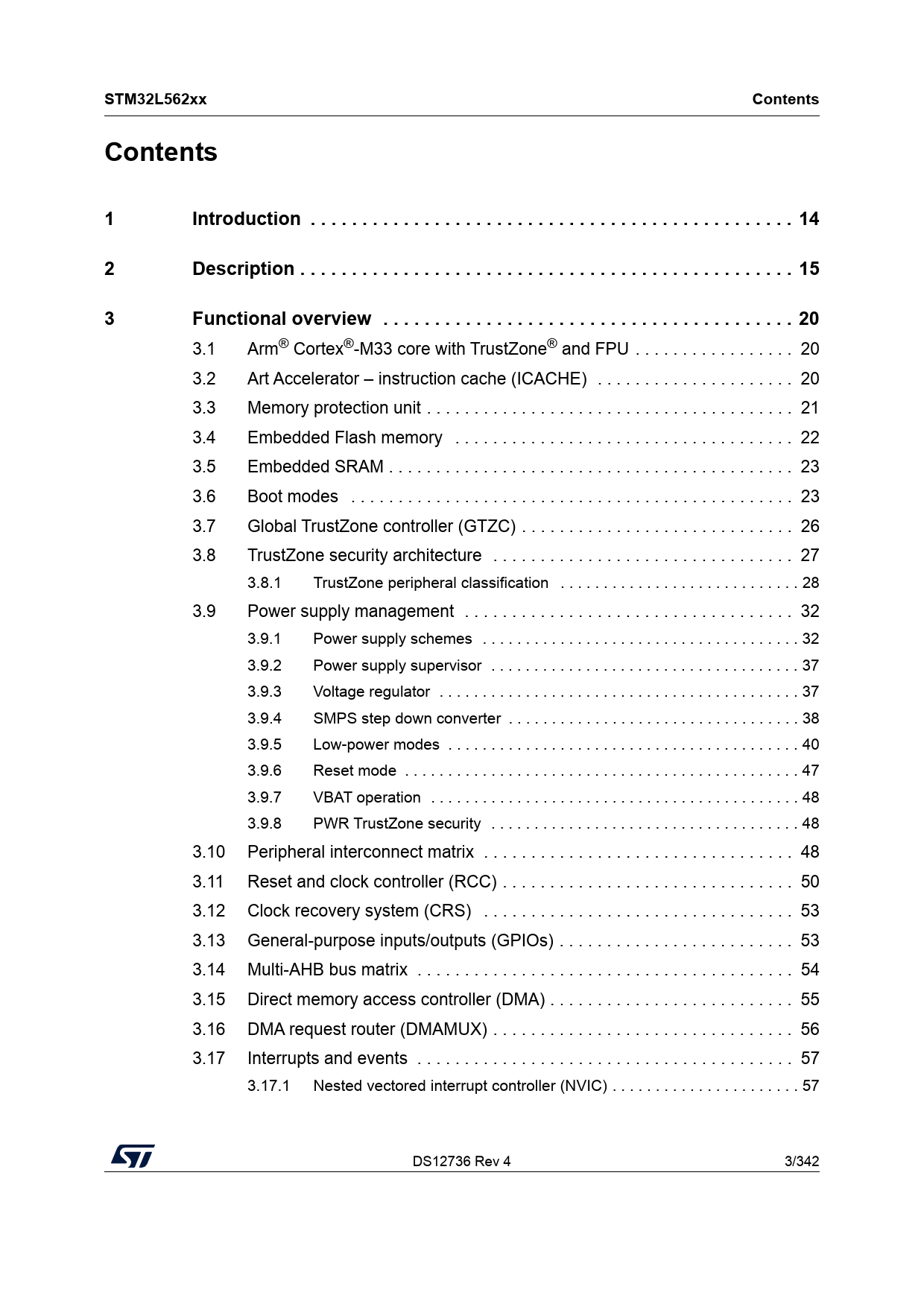 STM32L562xx Contents Contents 1 Introduction . 14 2 Description . 15 3 Functional overview . 20