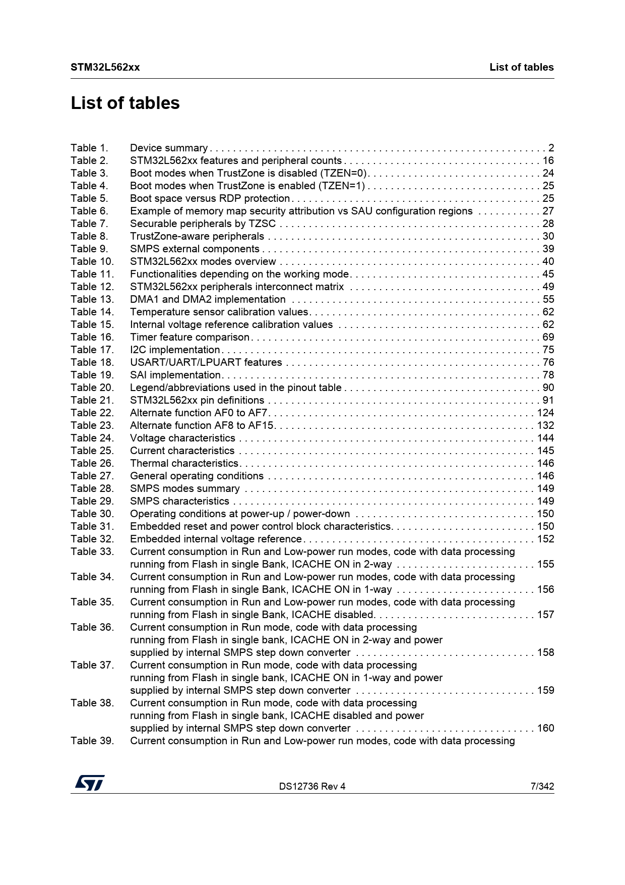 link to page 2 link to page 16 link to page 24 link to page 25 link to page 25 link to page 27 link to page 28 link to page 30 link to page 39 link to page 40 link to page 45 link to page 49 link to page 55 link to page 62 link to page 62 link to page 69 link to page 75 link to page 76 link to page 78 link to page 90 link to page 91 link to page 124 link to page 132 link to page 144 link to page 145 link to page 146 link to page 146 link to page 149 link to page 149 link to page 150 link to page 150 link to page 152 link to page 155 link to page 156 link to page 157 link to page 158 link to page 159 link to page 160 link to page 161 STM32L562xxList of tablesList of tables Table 1. Device summary . 2 Table 2. STM32L562xx features and peripheral counts . 16 Table 3. Boot modes when TrustZone is disabled (TZEN=0). 24 Table 4. Boot modes when TrustZone is enabled (TZEN=1) . 25 Table 5. Boot space versus RDP protection . 25 Table 6. Example of memory map security attribution vs SAU configuration regions . 27 Table 7. Securable peripherals by TZSC . 28 Table 8. TrustZone-aware peripherals . 30 Table 9. SMPS external components . 39 Table 10. STM32L562xx modes overview . 40 Table 11. Functionalities depending on the working mode. 45 Table 12. STM32L562xx peripherals interconnect matrix . 49 Table 13. DMA1 and DMA2 implementation . 55 Table 14. Temperature sensor calibration values. 62 Table 15. Internal voltage reference calibration values . 62 Table 16. Timer feature comparison . 69 Table 17. I2C implementation . 75 Table 18. USART/UART/LPUART features . 76 Table 19. SAI implementation. 78 Table 20. Legend/abbreviations used in the pinout table . 90 Table 21. STM32L562xx pin definitions . 91 Table 22. Alternate function AF0 to AF7. 124 Table 23. Alternate function AF8 to AF15. 132 Table 24. Voltage characteristics . 144 Table 25. Current characteristics . 145 Table 26. Thermal characteristics. 146 Table 27. General operating conditions . 146 Table 28. SMPS modes summary . 149 Table 29. SMPS characteristics . 149 Table 30. Operating conditions at power-up / power-down . 150 Table 31. Embedded reset and power control block characteristics. 150 Table 32. Embedded internal voltage reference. 152 Table 33. Current consumption in Run and Low-power run modes, code with data processing running from Flash in single Bank, ICACHE ON in 2-way . 155 Table 34. Current consumption in Run and Low-power run modes, code with data processing running from Flash in single Bank, ICACHE ON in 1-way . 156 Table 35. Current consumption in Run and Low-power run modes, code with data processing running from Flash in single Bank, ICACHE disabled. 157 Table 36. Current consumption in Run mode, code with data processing running from Flash in single bank, ICACHE ON in 2-way and power supplied by internal SMPS step down converter . 158 Table 37. Current consumption in Run mode, code with data processing running from Flash in single bank, ICACHE ON in 1-way and power supplied by internal SMPS step down converter . 159 Table 38. Current consumption in Run mode, code with data processing running from Flash in single bank, ICACHE disabled and power supplied by internal SMPS step down converter . 160 Table 39. Current consumption in Run and Low-power run modes, code with data processing DS12736 Rev 4 7/342 11 Document Outline Table 1. Device summary 1 Introduction 2 Description Table 2. STM32L562xx features and peripheral counts Figure 1. STM32L562xx block diagram 3 Functional overview 3.1 Arm® Cortex®-M33 core with TrustZone® and FPU 3.2 Art Accelerator – instruction cache (ICACHE) 3.3 Memory protection unit 3.4 Embedded Flash memory 3.5 Embedded SRAM 3.6 Boot modes Table 3. Boot modes when TrustZone is disabled (TZEN=0) Table 4. Boot modes when TrustZone is enabled (TZEN=1) Table 5. Boot space versus RDP protection 3.7 Global TrustZone controller (GTZC) 3.8 TrustZone security architecture Table 6. Example of memory map security attribution vs SAU configuration regions 3.8.1 TrustZone peripheral classification Table 7. Securable peripherals by TZSC (continued) Table 8. TrustZone-aware peripherals 3.9 Power supply management 3.9.1 Power supply schemes Figure 2. STM32L562xx power supply overview Figure 3. STM32L562xxxxP power supply overview Figure 4. STM32L562xxxxQ power supply overview Figure 5. Power-up/down sequence 3.9.2 Power supply supervisor 3.9.3 Voltage regulator 3.9.4 SMPS step down converter Figure 6. SMPS step down converter power supply scheme Table 9. SMPS external components 3.9.5 Low-power modes Table 10. STM32L562xx modes overview Table 11. Functionalities depending on the working mode 3.9.6 Reset mode 3.9.7 VBAT operation 3.9.8 PWR TrustZone security 3.10 Peripheral interconnect matrix Table 12. STM32L562xx peripherals interconnect matrix 3.11 Reset and clock controller (RCC) Figure 7. STM32L562xx clock tree 3.12 Clock recovery system (CRS) 3.13 General-purpose inputs/outputs (GPIOs) 3.14 Multi-AHB bus matrix Figure 8. Multi-AHB bus matrix 3.15 Direct memory access controller (DMA) Table 13. DMA1 and DMA2 implementation 3.16 DMA request router (DMAMUX) 3.17 Interrupts and events 3.17.1 Nested vectored interrupt controller (NVIC) 3.17.2 Extended interrupt/event controller (EXTI) 3.18 Cyclic redundancy check calculation unit (CRC) 3.19 Flexible static memory controller (FSMC) 3.20 Octo-SPI interface (OCTOSPI) 3.21 Analog-to-digital converter (ADC) 3.21.1 Temperature sensor Table 14. Temperature sensor calibration values 3.21.2 Internal voltage reference (VREFINT) Table 15. Internal voltage reference calibration values 3.21.3 VBAT battery voltage monitoring 3.22 Digital to analog converter (DAC) 3.23 Voltage reference buffer (VREFBUF) Figure 9. Voltage reference buffer 3.24 Comparators (COMP) 3.25 Operational amplifier (OPAMP) 3.26 Digital filter for sigma-delta modulators (DFSDM) 3.27 Touch sensing controller (TSC) 3.28 True random number generator (RNG) 3.29 Advanced encryption standard hardware accelerator 