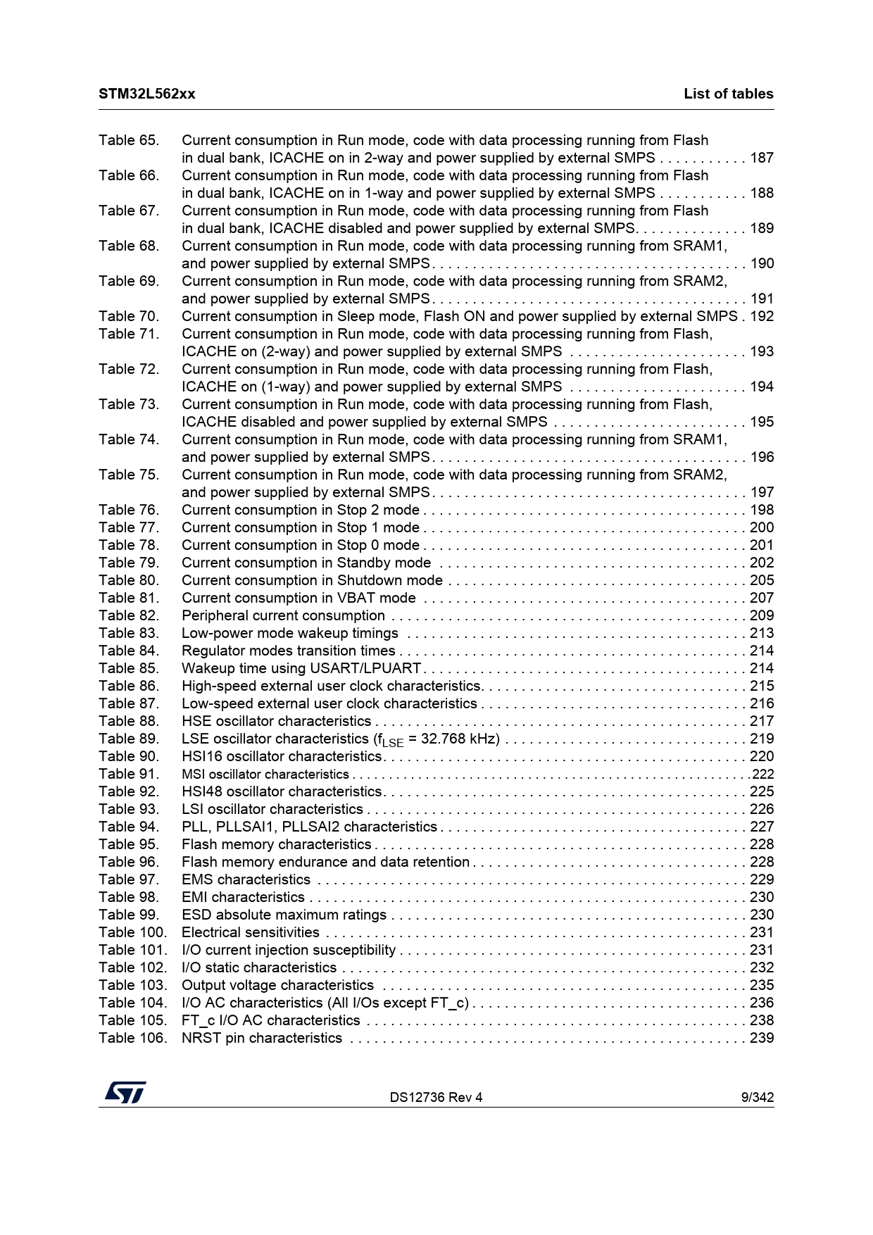link to page 187 link to page 188 link to page 189 link to page 190 link to page 191 link to page 192 link to page 193 link to page 194 link to page 195 link to page 196 link to page 197 link to page 198 link to page 200 link to page 201 link to page 202 link to page 205 link to page 207 link to page 209 link to page 213 link to page 214 link to page 214 link to page 215 link to page 216 link to page 217 link to page 219 link to page 220 link to page 222 link to page 225 link to page 226 link to page 227 link to page 228 link to page 228 link to page 229 link to page 230 link to page 230 link to page 231 link to page 231 link to page 232 link to page 235 link to page 236 link to page 238 link to page 239 STM32L562xxList of tables Table 65. Current consumption in Run mode, code with data processing running from Flash in dual bank, ICACHE on in 2-way and power supplied by external SMPS . 187 Table 66. Current consumption in Run mode, code with data processing running from Flash in dual bank, ICACHE on in 1-way and power supplied by external SMPS . 188 Table 67. Current consumption in Run mode, code with data processing running from Flash in dual bank, ICACHE disabled and power supplied by external SMPS. 189 Table 68. Current consumption in Run mode, code with data processing running from SRAM1, and power supplied by external SMPS. 190 Table 69. Current consumption in Run mode, code with data processing running from SRAM2, and power supplied by external SMPS. 191 Table 70. Current consumption in Sleep mode, Flash ON and power supplied by external SMPS . 192 Table 71. Current consumption in Run mode, code with data processing running from Flash, ICACHE on (2-way) and power supplied by external SMPS . 193 Table 72. Current consumption in Run mode, code with data processing running from Flash, ICACHE on (1-way) and power supplied by external SMPS . 194 Table 73. Current consumption in Run mode, code with data processing running from Flash, ICACHE disabled and power supplied by external SMPS . 195 Table 74. Current consumption in Run mode, code with data processing running from SRAM1, and power supplied by external SMPS. 196 Table 75. Current consumption in Run mode, code with data processing running from SRAM2, and power supplied by external SMPS. 197 Table 76. Current consumption in Stop 2 mode . 198 Table 77. Current consumption in Stop 1 mode . 200 Table 78. Current consumption in Stop 0 mode . 201 Table 79. Current consumption in Standby mode . 202 Table 80. Current consumption in Shutdown mode . 205 Table 81. Current consumption in VBAT mode . 207 Table 82. Peripheral current consumption . 209 Table 83. Low-power mode wakeup timings . 213 Table 84. Regulator modes transition times . 214 Table 85. Wakeup time using USART/LPUART . 214 Table 86. High-speed external user clock characteristics. 215 Table 87. Low-speed external user clock characteristics . 216 Table 88. HSE oscillator characteristics . 217 Table 89. LSE oscillator characteristics (fLSE = 32.768 kHz) . 219 Table 90. HSI16 oscillator characteristics. 220 Table 91. MSI oscillator characteristics . .222 Table 92. HSI48 oscillator characteristics. 225 Table 93. LSI oscillator characteristics . 226 Table 94. PLL, PLLSAI1, PLLSAI2 characteristics . 227 Table 95. Flash memory characteristics . 228 Table 96. Flash memory endurance and data retention . 228 Table 97. EMS characteristics . 229 Table 98. EMI characteristics . 230 Table 99. ESD absolute maximum ratings . 230 Table 100. Electrical sensitivities . 231 Table 101. I/O current injection susceptibility . 231 Table 102. I/O static characteristics . 232 Table 103. Output voltage characteristics . 235 Table 104. I/O AC characteristics (All I/Os except FT_c) . 236 Table 105. FT_c I/O AC characteristics . 238 Table 106. NRST pin characteristics . 239 DS12736 Rev 4 9/342 11 Document Outline Table 1. Device summary 1 Introduction 2 Description Table 2. STM32L562xx features and peripheral counts Figure 1. STM32L562xx block diagram 3 Functional overview 3.1 Arm® Cortex®-M33 core with TrustZone® and FPU 3.2 Art Accelerator – instruction cache (ICACHE) 3.3 Memory protection unit 3.4 Embedded Flash memory 3.5 Embedded SRAM 3.6 Boot modes Table 3. Boot modes when TrustZone is disabled (TZEN=0) Table 4. Boot modes when TrustZone is enabled (TZEN=1) Table 5. Boot space versus RDP protection 3.7 Global TrustZone controller (GTZC) 3.8 TrustZone security architecture Table 6. Example of memory map security attribution vs SAU configuration regions 3.8.1 TrustZone peripheral classification Table 7. Securable peripherals by TZSC (continued) Table 8. TrustZone-aware peripherals 3.9 Power supply management 3.9.1 Power supply schemes Figure 2. STM32L562xx power supply overview Figure 3. STM32L562xxxxP power supply overview Figure 4. STM32L562xxxxQ power supply overview Figure 5. Power-up/down sequence 3.9.2 Power supply supervisor 3.9.3 Voltage regulator 3.9.4 SMPS step down converter Figure 6. SMPS step down converter power supply scheme Table 9. SMPS external components 3.9.5 Low-power modes Table 10. STM32L562xx modes overview Table 11. Functionalities depending on the working mode 3.9.6 Reset mode 3.9.7 VBAT operation 3.9.8 PWR TrustZone security 3.10 Peripheral interconnect matrix Table 12. STM32L562xx peripherals interconnect matrix 3.11 Reset and clock controller (RCC) Figure 7. STM32L562xx clock tree 3.12 Clock recovery system (CRS) 3.13 General-purpose inputs/outputs (GPIOs) 3.14 Multi-AHB bus matrix Figure 8. Multi-AHB bus matrix 3.15 Direct memory access controller (DMA) Table 13. DMA1 and DMA2 implementation 3.16 DMA request router (DMAMUX) 3.17 Interrupts and events 3.17.1 Nested vectored interrupt controller (NVIC) 3.17.2 Extended interrupt/event controller (EXTI) 3.18 Cyclic redundancy check calculation unit (CRC) 3.19 Flexible static memory controller (FSMC) 3.20 Octo-SPI interface (OCTOSPI) 3.21 Analog-to-digital converter (ADC) 3.21.1 Temperature sensor Table 14. Temperature sensor