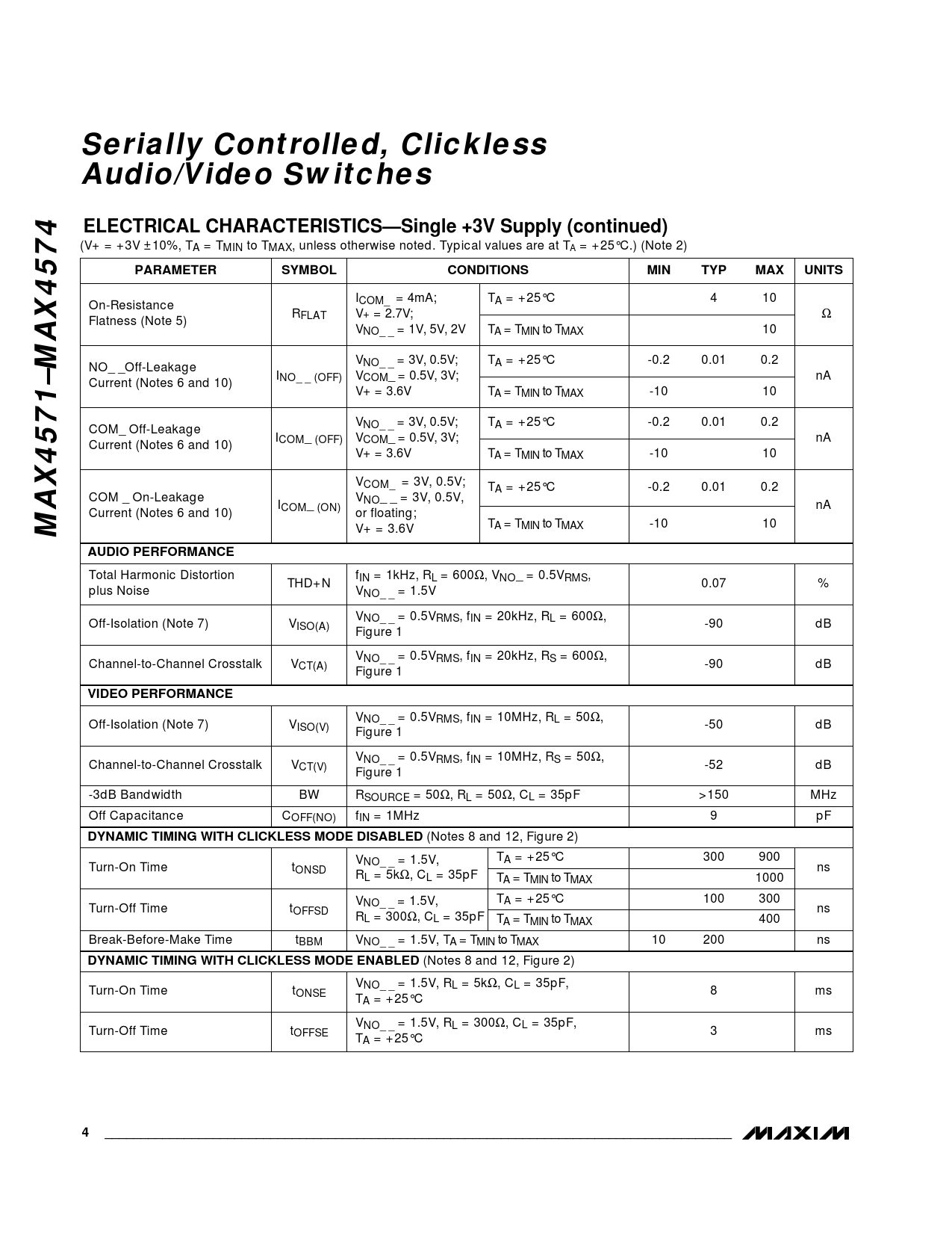 Serially Controlled, Clickless Audio/Video Switches. ELECTRICAL CHARACTERISTICS—Single +3V Supply (continued). PARAMETER