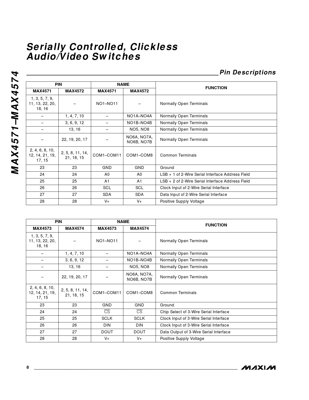Serially Controlled, Clickless Audio/Video Switches. Pin Descriptions. PIN. NAME. FUNCTION. MAX4571. MAX4572. MAX4571–MAX4574. MAX4573