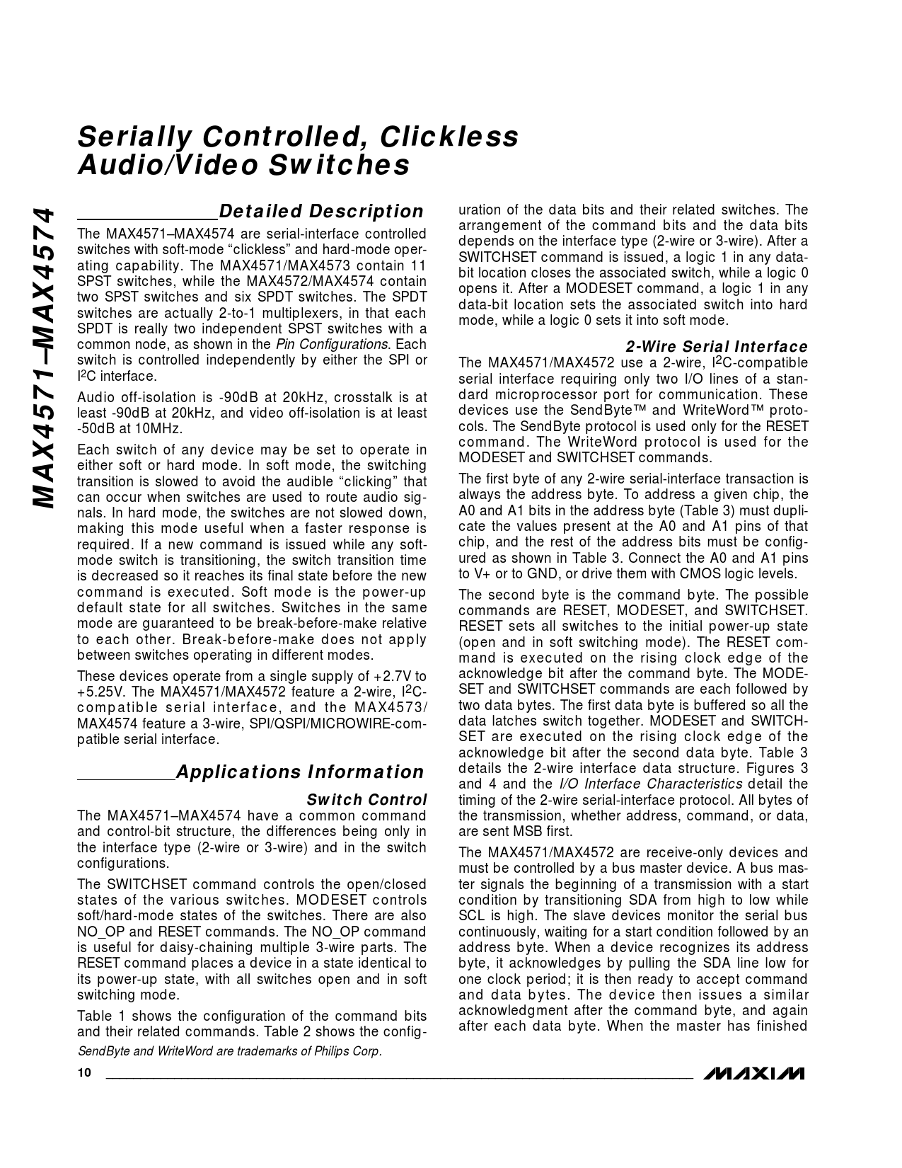 Serially Controlled, Clickless Audio/Video Switches Detailed Description 2-Wire Serial Interface MAX4571–MAX4574