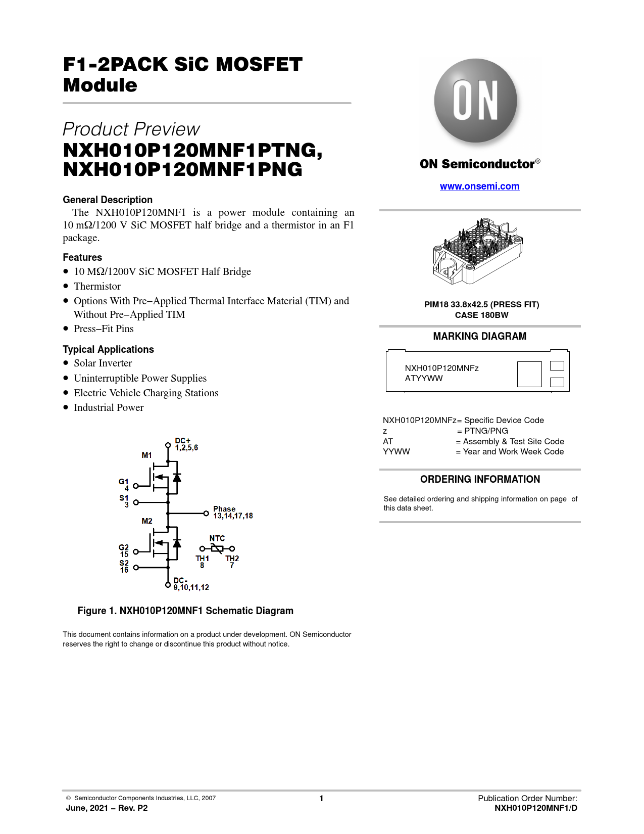 • Solar Inverter NXH010P120MNFz • Uninterruptible Power Supplies ATYYWW • Electric Vehicle Charging Stations • Industrial Power NXH010P120MNFz= Specific Device Code z = PTNG/PNG AT = Assembly & Test Site Code YYWW = Year and Work Week Code