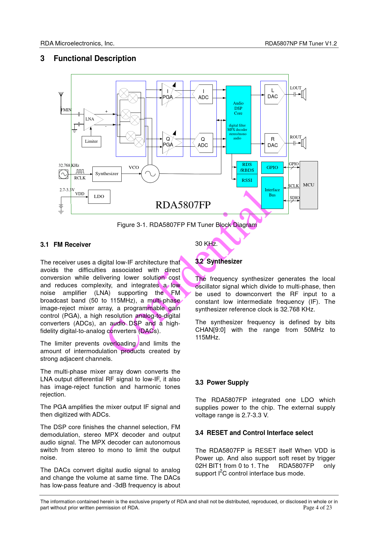 LOUT I I L PGA ADC DAC Audio DSP FMIN + Core LNA - digital filter MPX decoder stereo/mono ROUT Q Q audio R Limiter PGA ADC DAC RDS GPIO 32.768 KHz VCO GPIO /RBDS Synthesizer RCLK RSSI SCLK MCU 2.7-3.3V Interface VDD Bus LDO SDIO RDA5807FP Figure 3-1. RDA5807FP FM Tuner Block Diagram
