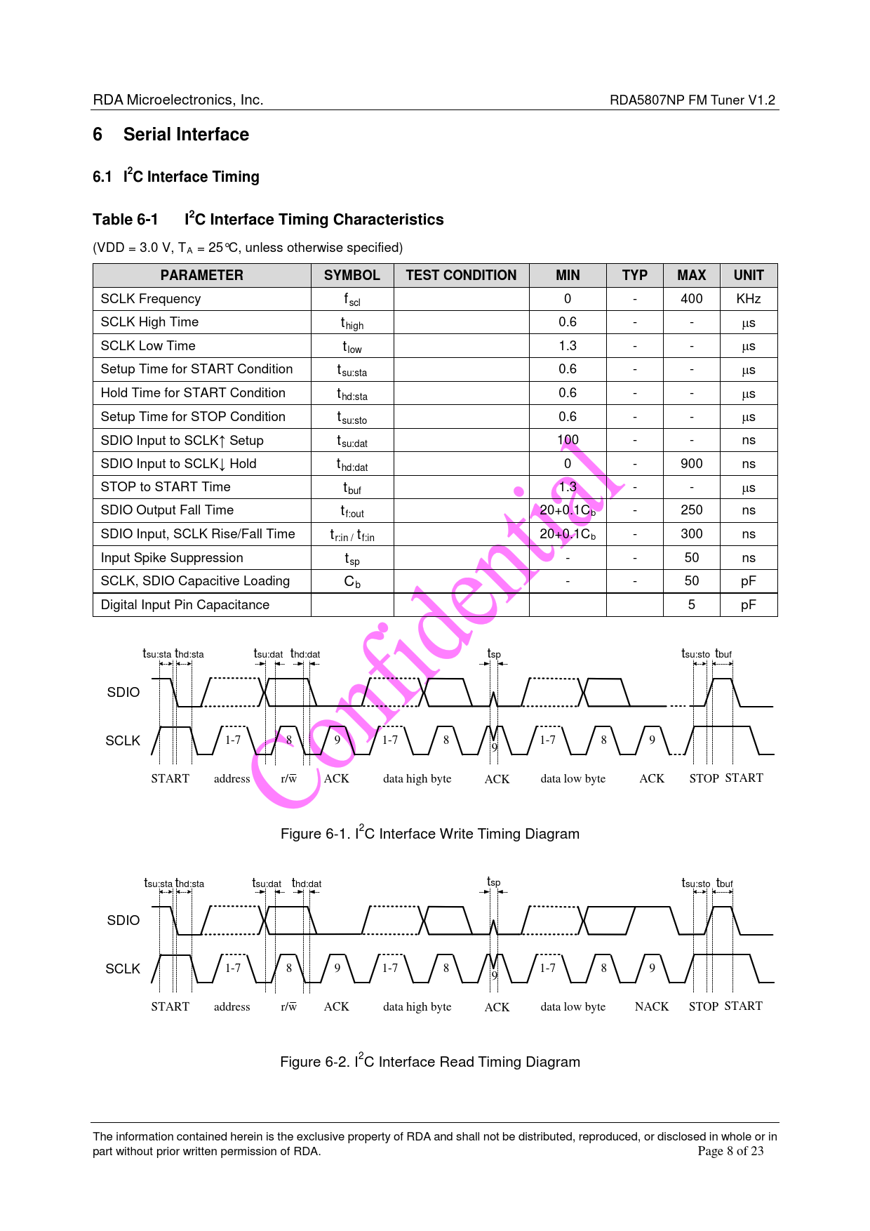6 Serial Interface 6.1 I2C Interface Timing Table 6-1 I2C Interface Timing Characteristics
