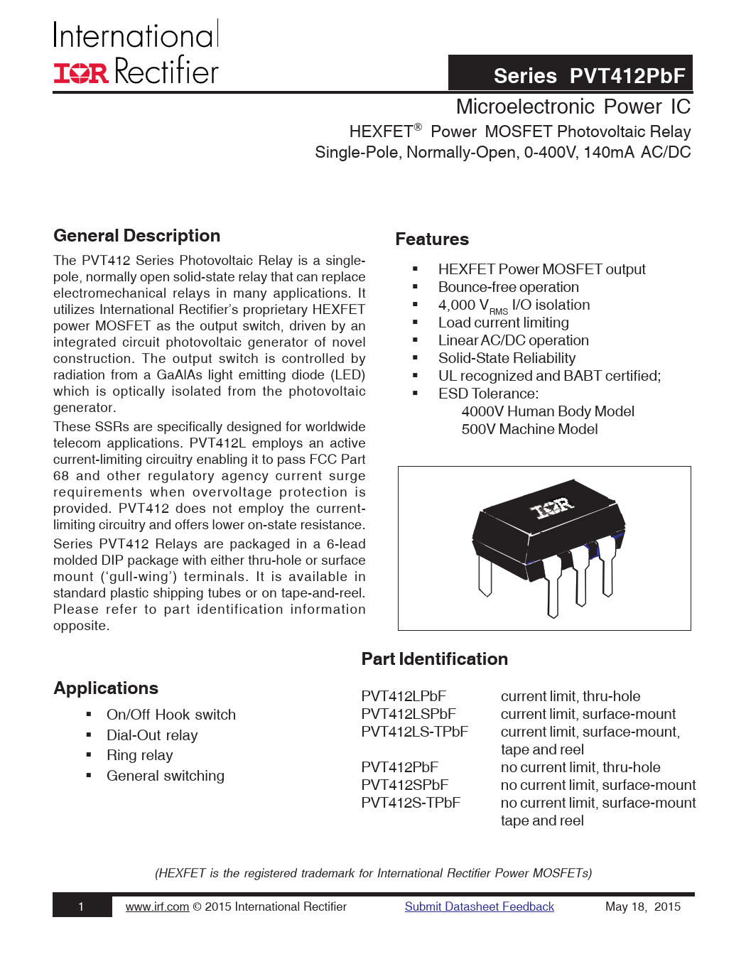 PVT412LPbF current limit, thru-hole On/Off Hook switch PVT412LSPbF current limit, surface-mount Dial-Out relay PVT412LS-TPbF current limit, surface-mount, Ring relay tape and reel PVT412PbF no current limit, thru-hole General switching PVT412SPbF no current limit, surface-mount PVT412S-TPbF no current limit, surface-mount tape and reel (HEXFET is the registered trademark for International Rectifier Power MOSFETs) 1 www.irf.com © 2015 International Rectifier Submit Datasheet Feedback May 18, 2015