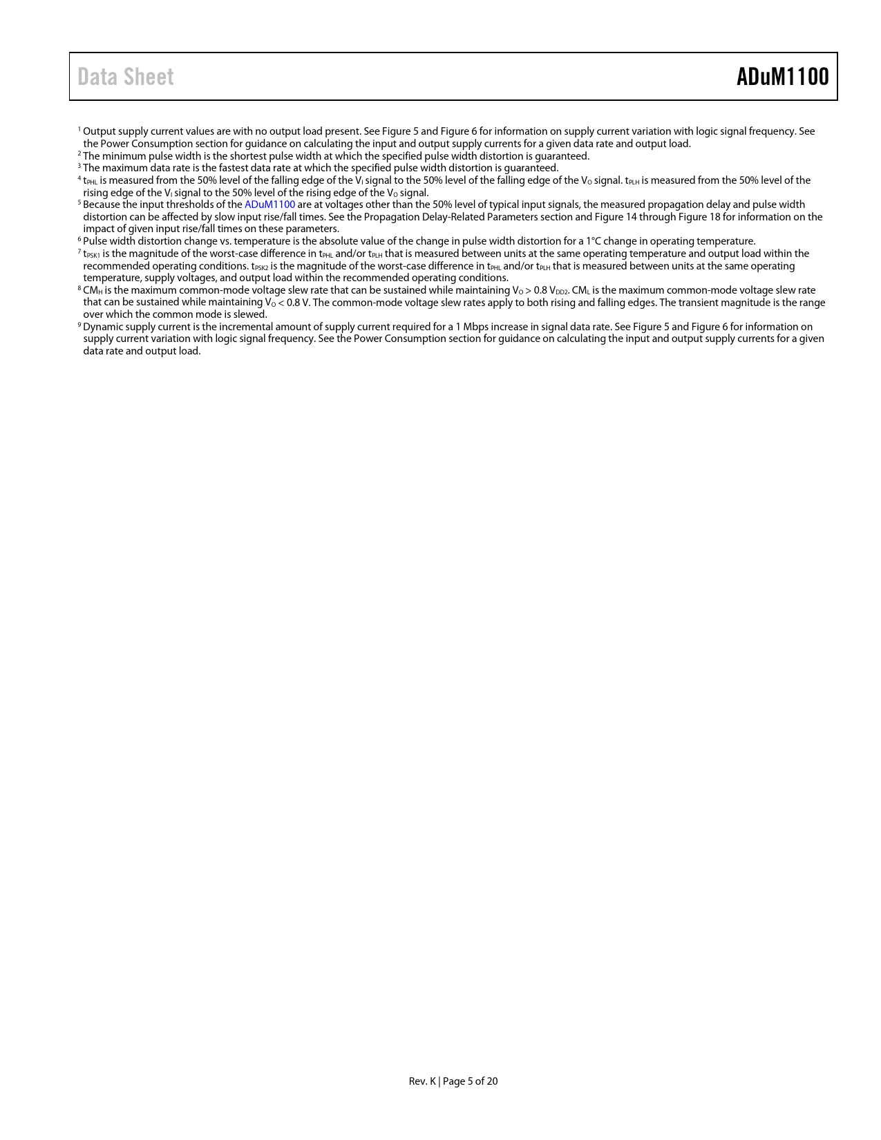 link to page 14 link to page 14 link to page 18 link to page 16 link to page 16 link to page 17 link to page 14 link to page 14 link to page 18 Data SheetADuM1100 1 Output supply current values are with no output load present. See Figure 5 and Figure 6 for information on supply current variation with logic signal frequency. See the Power Consumption section for guidance on calculating the input and output supply currents for a given data rate and output load. 2 The minimum pulse width is the shortest pulse width at which the specified pulse width distortion is guaranteed. 3 The maximum data rate is the fastest data rate at which the specified pulse width distortion is guaranteed. 4 tPHL is measured from the 50% level of the falling edge of the VI signal to the 50% level of the falling edge of the VO signal. tPLH is measured from the 50% level of the rising edge of the VI signal to the 50% level of the rising edge of the VO signal. 5 Because the input thresholds of the ADuM1100 are at voltages other than the 50% level of typical input signals, the measured propagation delay and pulse width distortion can be affected by slow input rise/fal times. See the Propagation Delay-Related Parameters section and Figure 14 through Figure 18 for information on the impact of given input rise/fall times on these parameters. 6 Pulse width distortion change vs. temperature is the absolute value of the change in pulse width distortion for a 1°C change in operating temperature. 7 tPSK1 is the magnitude of the worst-case difference in tPHL and/or tPLH that is measured between units at the same operating temperature and output load within the recommended operating conditions. tPSK2 is the magnitude of the worst-case difference in tPHL and/or tPLH that is measured between units at the same operating temperature, supply voltages, and output load within the recommended operating conditions. 8 CMH is the maximum common-mode voltage slew rate that can be sustained while maintaining VO > 0.8 VDD2. CML is the maximum common-mode voltage slew rate that can be sustained while maintaining VO < 0.8 V. The common-mode voltage slew rates apply to both rising and fal ing edges. The transient magnitude is the range over which the common mode is slewed. 9 Dynamic supply current is the incremental amount of supply current required for a 1 Mbps increase in signal data rate. See Figure 5 and Figure 6 for information on supply current variation with logic signal frequency. See the Power Consumption section for guidance on calculating the input and output supply currents for a given data rate and output load. Rev. K | Page 5 of 20 Document Outline FEATURES APPLICATIONS GENERAL DESCRIPTION FUNCTIONAL BLOCK DIAGRAM TABLE OF CONTENTS REVISION HISTORY SPECIFICATIONS ELECTRICAL SPECIFICATIONS—5 V OPERATION ELECTRICAL SPECIFICATIONS—3.3 V OPERATION ELECTRICAL SPECIFICATIONS—MIXED 5 V/3 V OR 3 V/5 V OPERATION PACKAGE CHARACTERISTICS REGULATORY INFORMATION INSULATION AND SAFETY-RELATED SPECIFICATIONS DIN V VDE V 0884-10 (VDE V 0884-10):2006-12 INSULATION CHARACTERISTICS RECOMMENDED OPERATING CONDITIONS ABSOLUTE MAXIMUM RATINGS ESD CAUTION PIN CONFIGURATION AND FUNCTION DESCRIPTIONS TYPICAL PERFORMANCE CHARACTERISTICS APPLICATION INFORMATION PC BOARD LAYOUT PROPAGATION DELAY-RELATED PARAMETERS METHOD OF OPERATION, DC CORRECTNESS, AND MAGNETIC FIELD IMMUNITY POWER CONSUMPTION OUTLINE DIMENSIONS ORDERING GUIDE