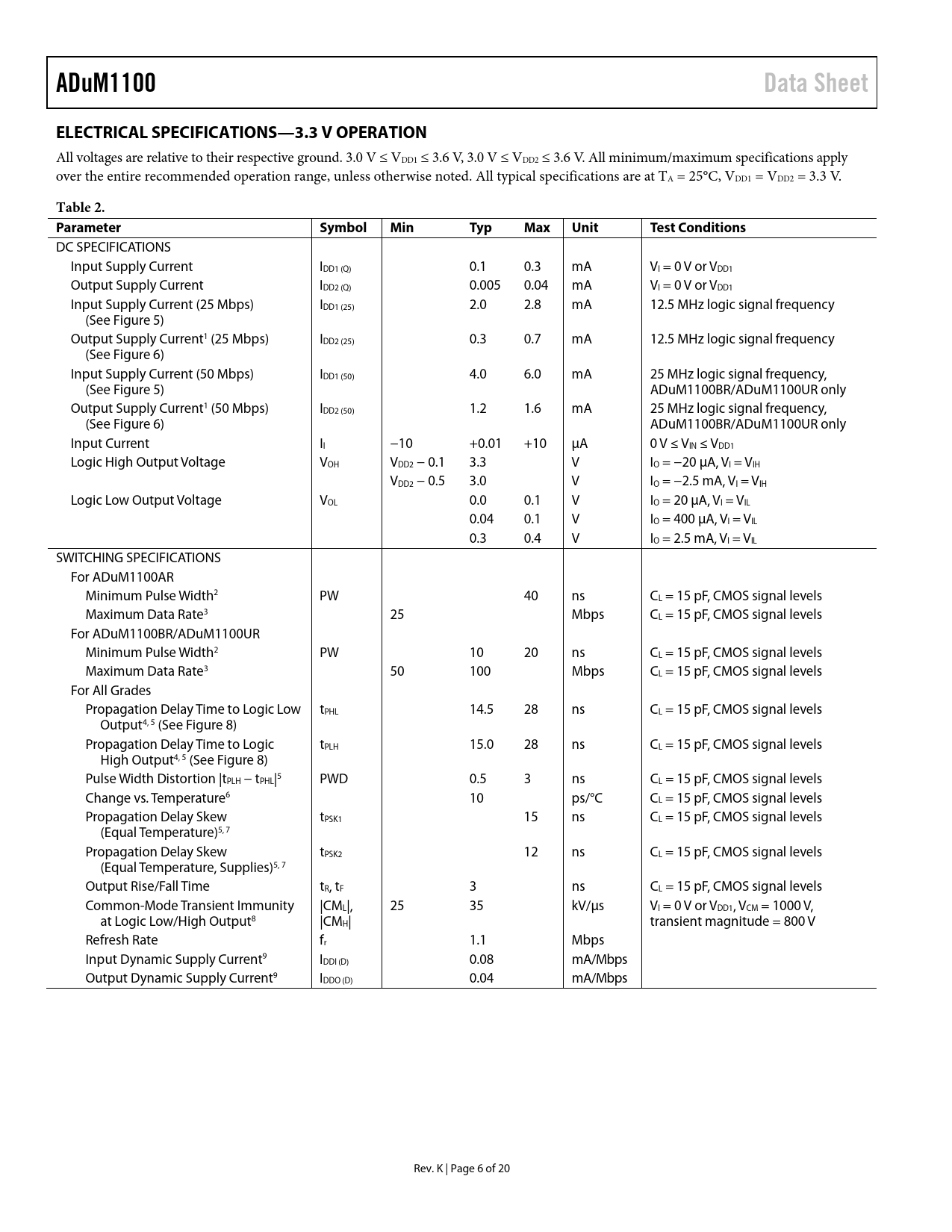 ADuM1100. Data Sheet. ELECTRICAL SPECIFICATIONS—3.3 V OPERATION. Table 2. Parameter. Symbol. Min. Typ. Max. Unit. Test Conditions