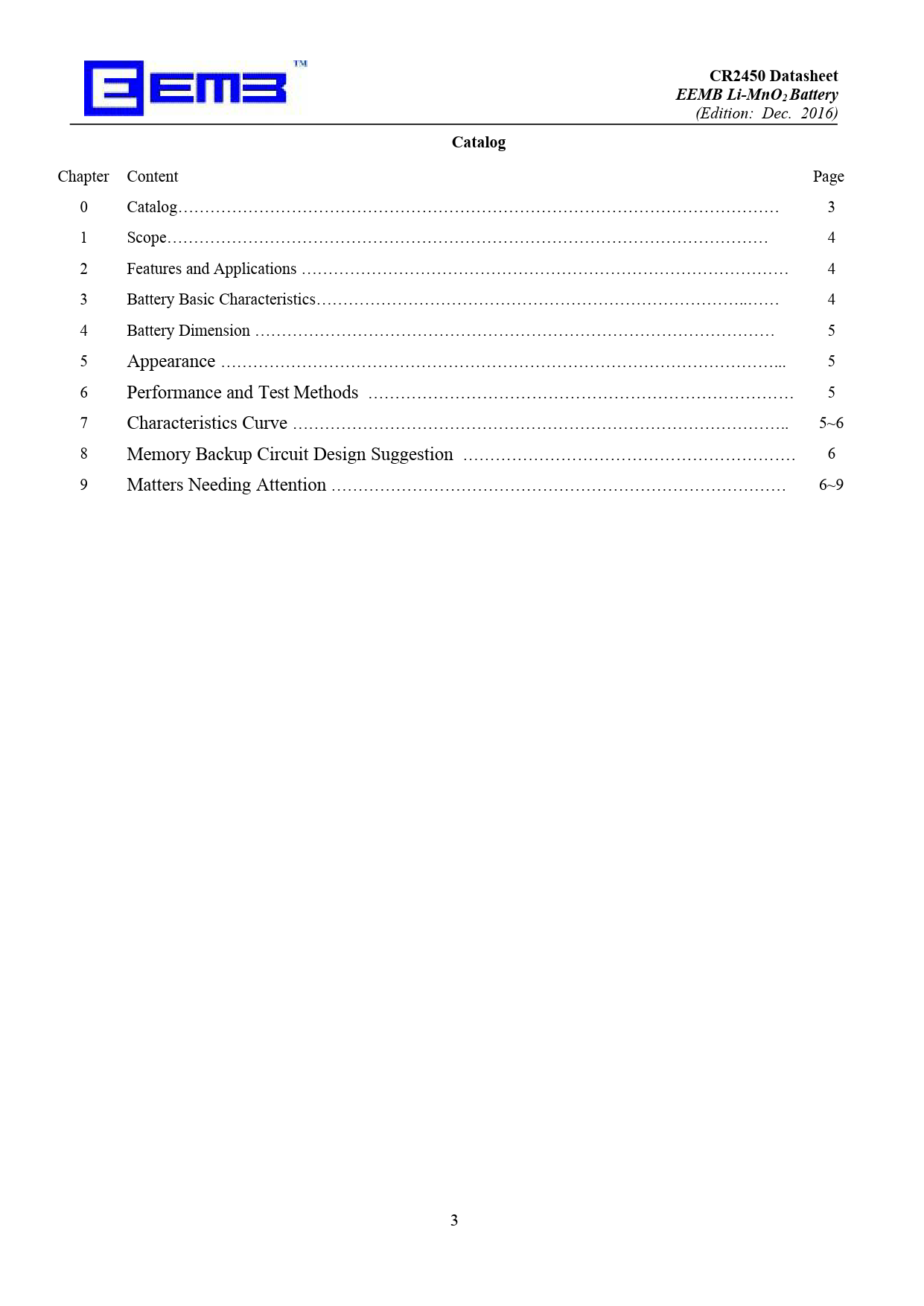 Páginas / Página9 / 3 — CR2450 Datasheet. EEMB Li-MnO2 Battery. Catalog