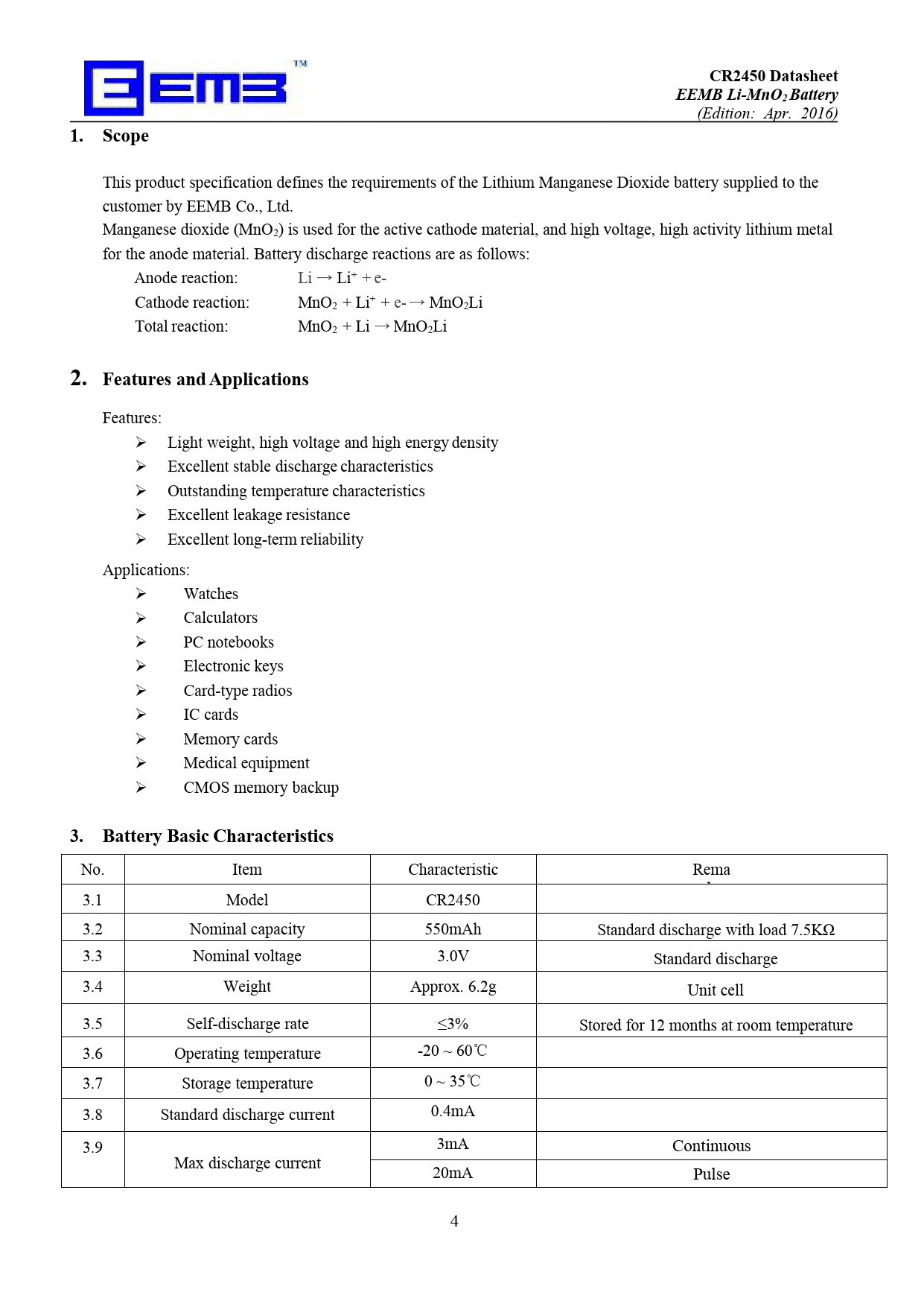 CR2450 DatasheetEEMB Li-MnO2 Battery (Edition: Apr. 2016) 1. Scope This product specification defines the requirements of the Lithium Manganese Dioxide battery supplied to the customer by EEMB Co., Ltd. Manganese dioxide (MnO2) is used for the active cathode material, and high voltage, high activity lithium metal for the anode material. Battery discharge reactions are as follows: Anode reaction: Li → Li+ + e- Cathode reaction: MnO2 + Li+ + e- → MnO2Li Total reaction: MnO2 + Li → MnO2Li 2. Features andApplications Features: Light weight, high voltage and high energy density Excellent stable discharge characteristics Outstanding temperature characteristics Excellent leakage resistance Excellent long-term reliability Applications: Watches Calculators PC notebooks Electronic keys Card-type radios IC cards Memory cards Medical equipment CMOS memory backup 3. Battery Basic Characteristics No. Item Characteristic Rema s rks 3.1 Model CR2450 3.2 Nominal capacity 550mAh Standard discharge with load 7.5KΩ 3.3 Nominal voltage 3.0V Standard discharge 3.4 Weight Approx. 6.2g Unit cell 3.5 Self-discharge rate ≤3% Stored for 12 months at room temperature 3.6 Operating temperature -20 ~ 60℃ 3.7 Storage temperature 0 ~ 35℃ 3.8 Standard discharge current 0.4mA 3.9 3mA Continuous Max discharge current 20mA Pulse 4 Document Outline EEMB CO., LTD Specification Battery Structure Scope Features and Applications Battery Basic Characteristics Performance and Test Methods Characteristics Curve Matters Needing Attention ! Caution ! Danger ! Warning ! Storage and Mount Overlapping Batteries Batteries put in a Metallic Container or on a Meta When a Battery is Held with Tweezers When Battery Lead Plates Touch Each Other Solder Bridges Short-circuited though Soldering Iron Shorts through Piled Circuit Board Discharge through Conductive Electrostatic Prevent Improper Battery Mounting Polarity Solder