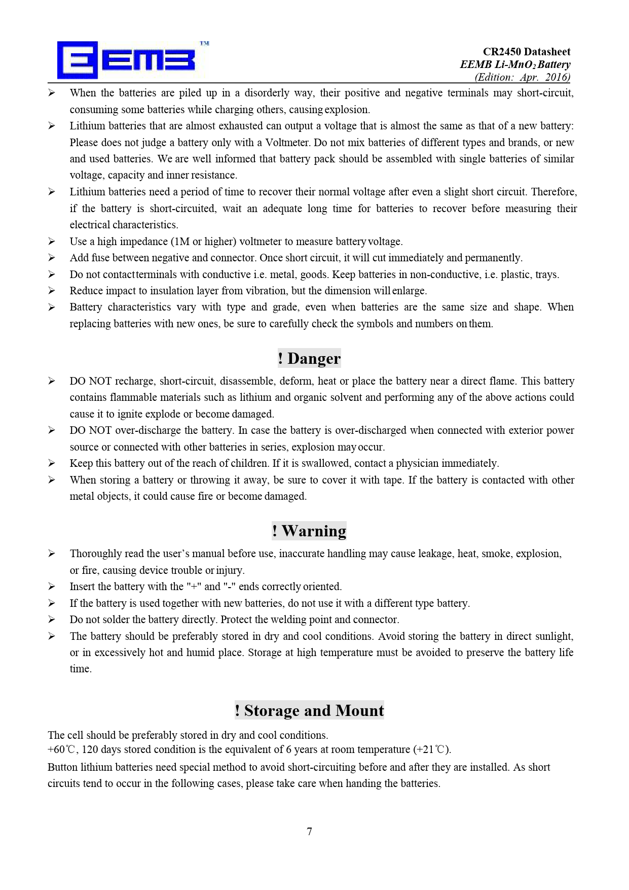CR2450 Datasheet EEMB Li-MnO2 Battery ! Danger ! Warning ! Storage and Mount
