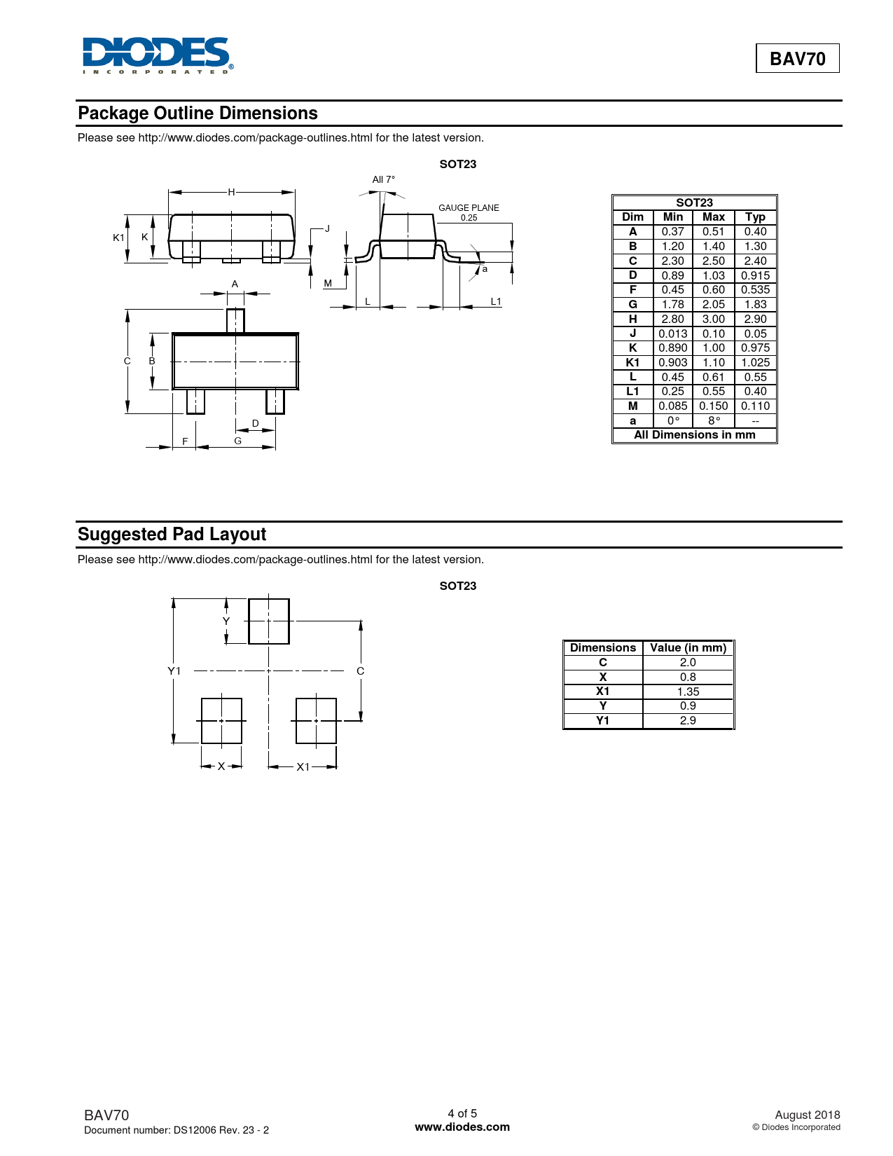 BAV70. Package Outline Dimensions. SOT23. Dim. Min. Max. Typ. All Dimensions in mm. Suggested Pad Layout. Dimensions Value (in mm)